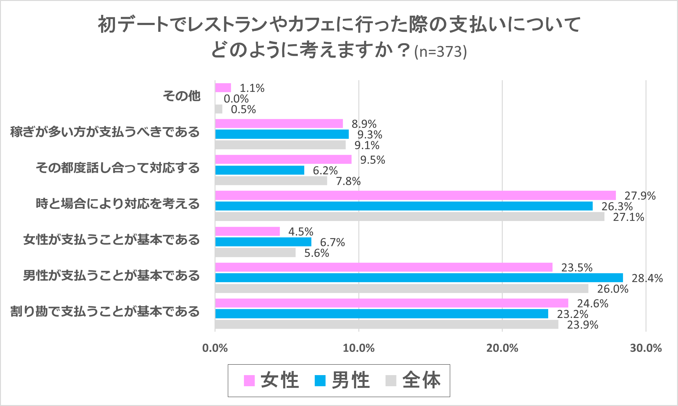 最初の設問で調査対象となる独身男女373人に「初デート時にレストランやカフェに行った際の支払いについてどのように考えますか?」と質問をしました。