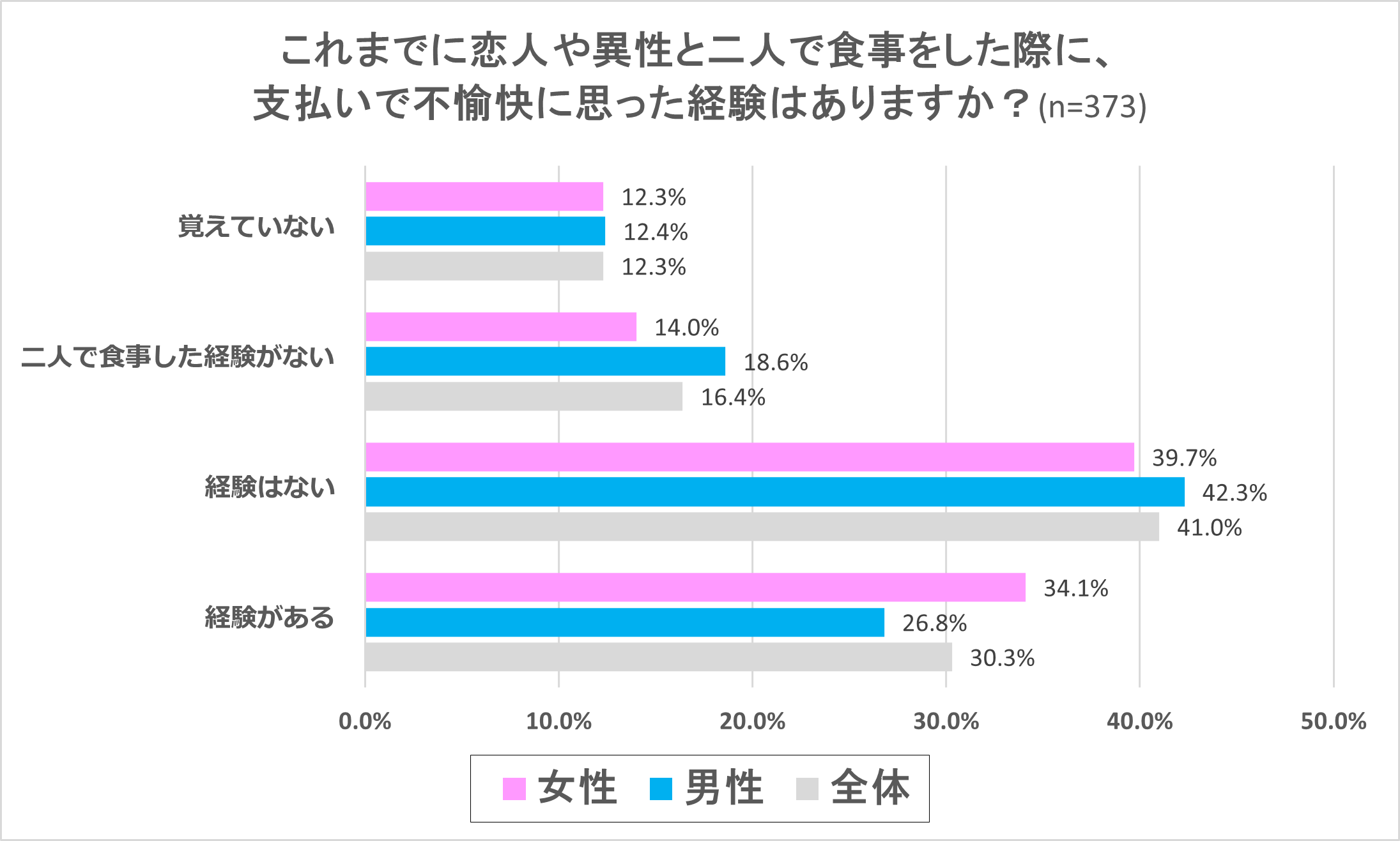 この設問への回答結果から、独身男女の約3割が異性との食事の支払いにおいて不愉快な思いをした経験があり、男性は4人に一人、女性は3人に一人が不愉快に思った経験があることがわかりました。