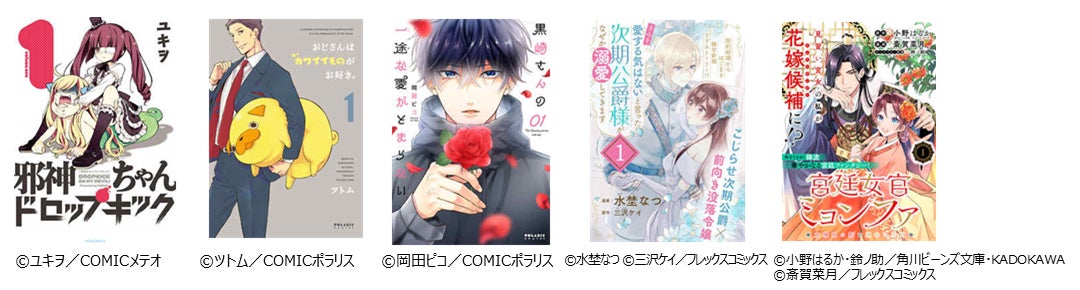 左から『邪神ちゃんドロップキック』(アニメ化)、『おじさんはカワイイものがお好き。』(実写ドラマ化)、『黒崎さんの一途な愛がとまらない』、『「きみを愛する気はない」と言った次期侯爵様がなぜか溺愛してきます』、『宮廷女官ミョンファ 太陽宮の影と運命の王妃』
