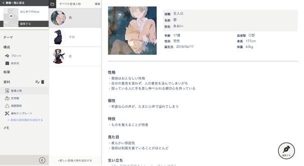 合わせて「Nola」では物語に登場する人物の名前、年齢、性格、見た目、生い立ち、能力・スキル、などのキャラクター設定を管理する行うこともできます。