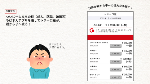株式会社デジタルガレージ(東証プライム 4819、本社:東京都渋谷区、代表取締役 兼 社長執行役員グループCEO:林 郁、以下:DG)は、「第14回販促会議 企画コンペティション(https://hansoku.co/)」にて、社員の考案した企画がゴールドを受賞したことをお知らせします。今回の受賞作品は、地域住民に寄り添い、伴走してきた株式会社千葉銀行の「便利でおトクな『ちばぎんアプリ』を知ってもらうためのアイデア」として、お金のやり取りに、親から子への想いを乗せるアイデアを企画したものです。