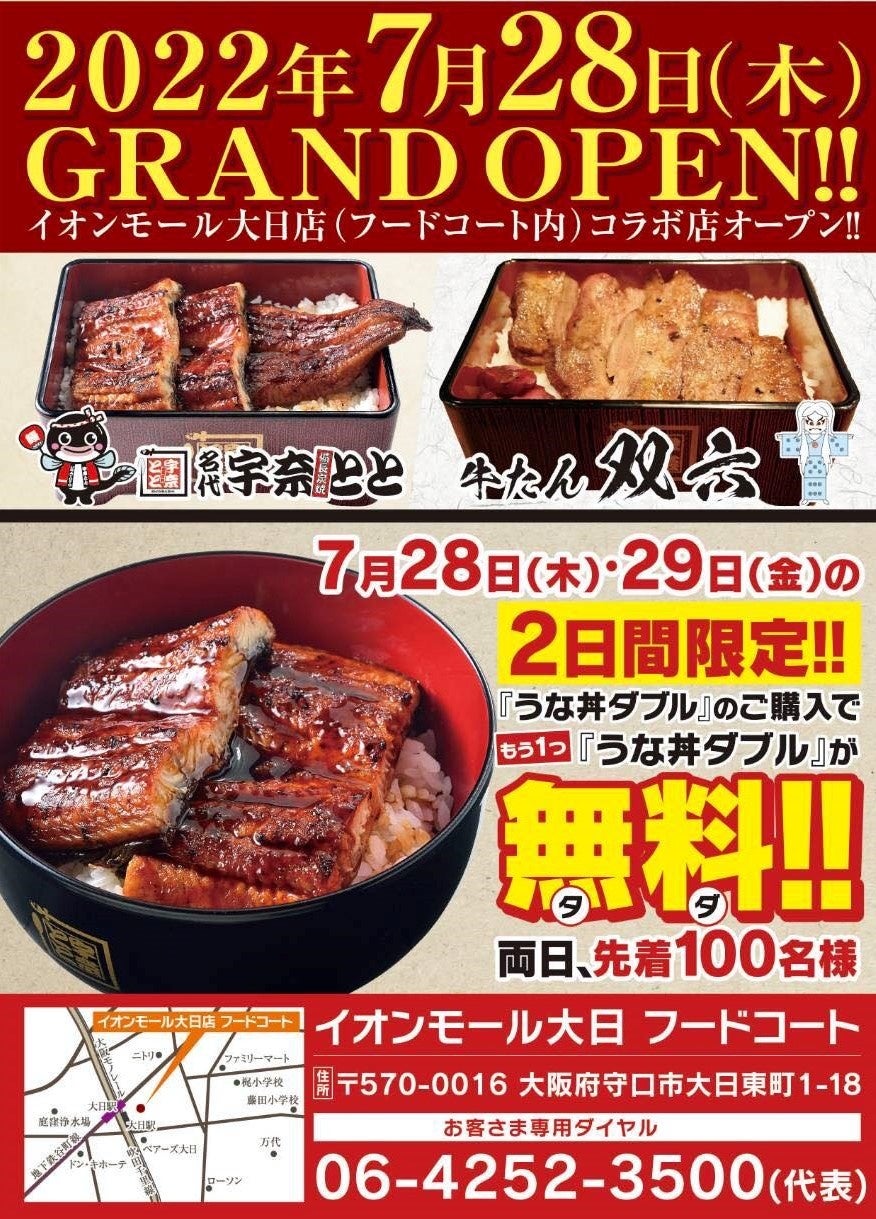 炭火焼にすることでうま味が凝縮される牛タンと鰻の蒲焼。両方を楽しめるコラボレーション店「名代 宇奈とと イオンモール大日店」が7月28日にOPENします。7月28、29日にはOPEN記念キャンペーンも実施します。