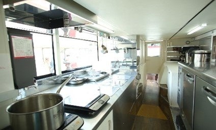 移動と食の融合により新たな感動体験を提供する「レストランバス」は、1階にキッチン、2階には対面式の座席とテーブルを備え、透明で開閉可能なオープンルーフは開放感があり、いつもと違う目線から眺める景色と、本格的な料理をお楽しみいただけます。東京レストランバスの外装は、東京らしさをイメージし、観光名所や和装をした女性を描き、モダンな雰囲気にデザインしています。内装は、シックな色合いでまとめ、夜は調光可能なLEDと間接照明により、高級感あふれる落ち着いた空間になっています。