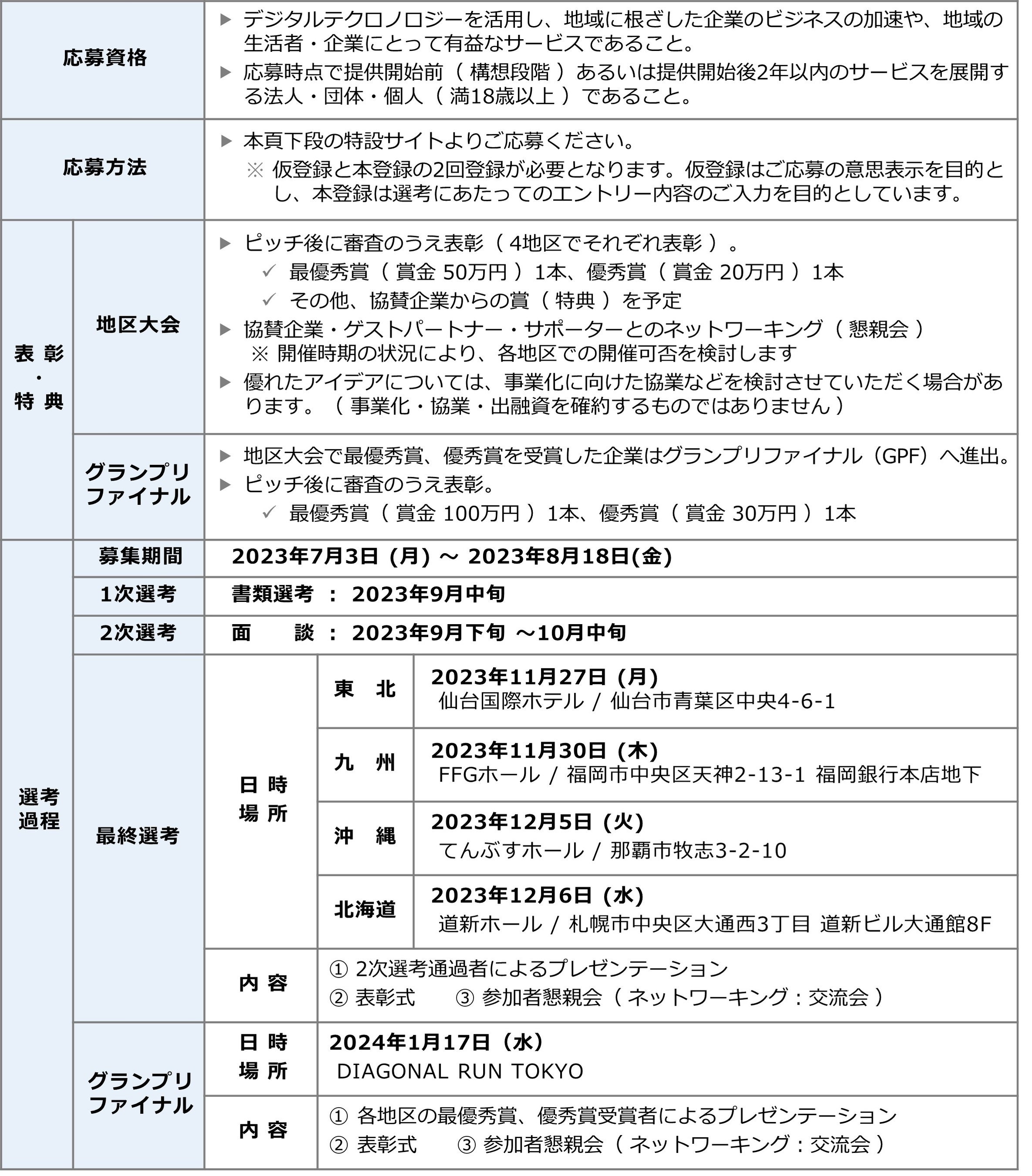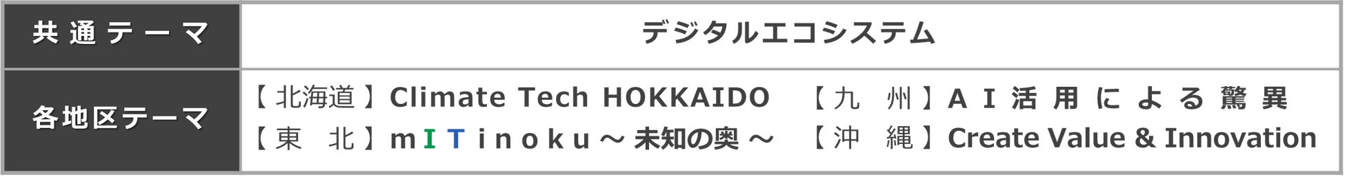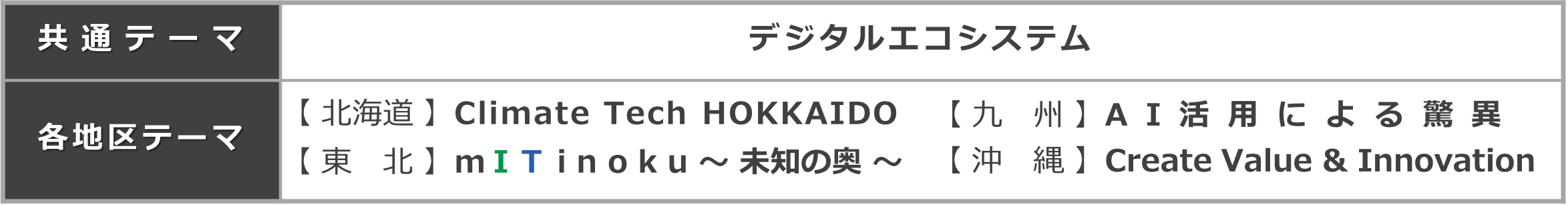 なお、今回で9回目となる全地区共通の募集テーマは、『 デジタルエコシステム 』です。相互に付加価値を創出する可能性を最大限に引き出し、未来を切り拓く新たな価値を提供するサービス、ビジネスアイデアを募集します。下記の各地区テーマと併せて、たくさんのご応募・ご参加をよろしくお願いします。