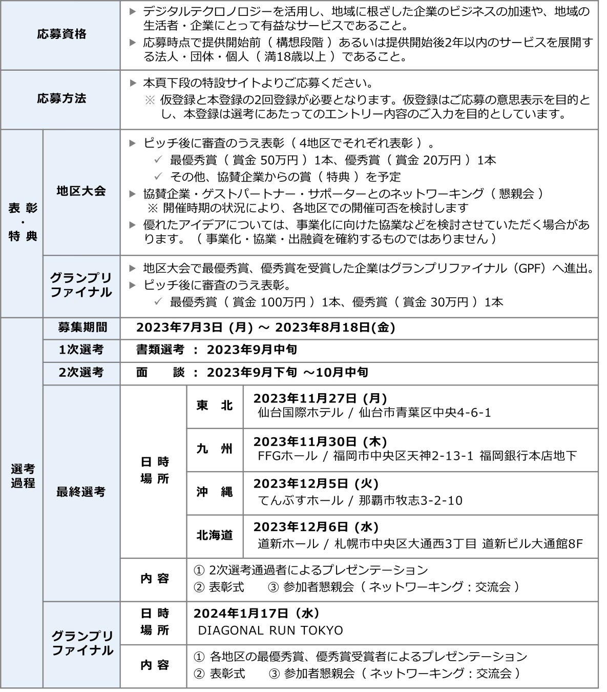 X-Tech Innovation は、各業界・業種横断でデジタルテクノロジーを活用した新しいサービスを広く募集し、優れたアイデアを発掘・表彰するビジネスコンテストです。北海道・東北・九州・沖縄の4地区にて地区大会を行い、各地区の最優秀賞、優秀賞の受賞者が集うグランプリファイナル( 以下、「GPF」)を東京にて実施します。また、各地区大会・GPF では、登壇企業と開催エリアの地場企業や協賛企業との交流の場を設けることで、参加企業間におけるマッチングの機会を創出します。