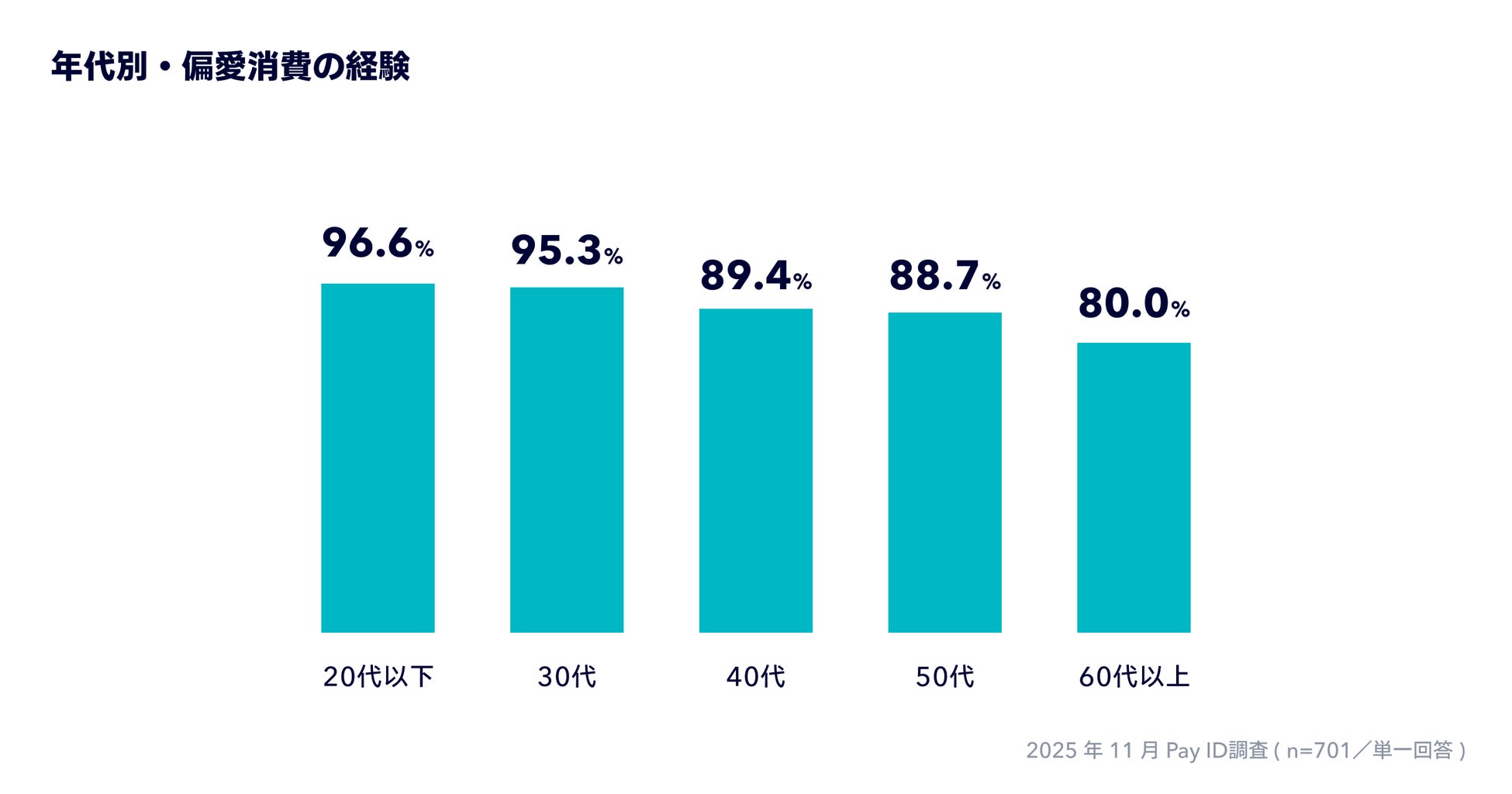 ユーザーの約9割が偏愛消費を経験。調査をした全ての年代で8割以上が偏愛消費の「経験あり」。