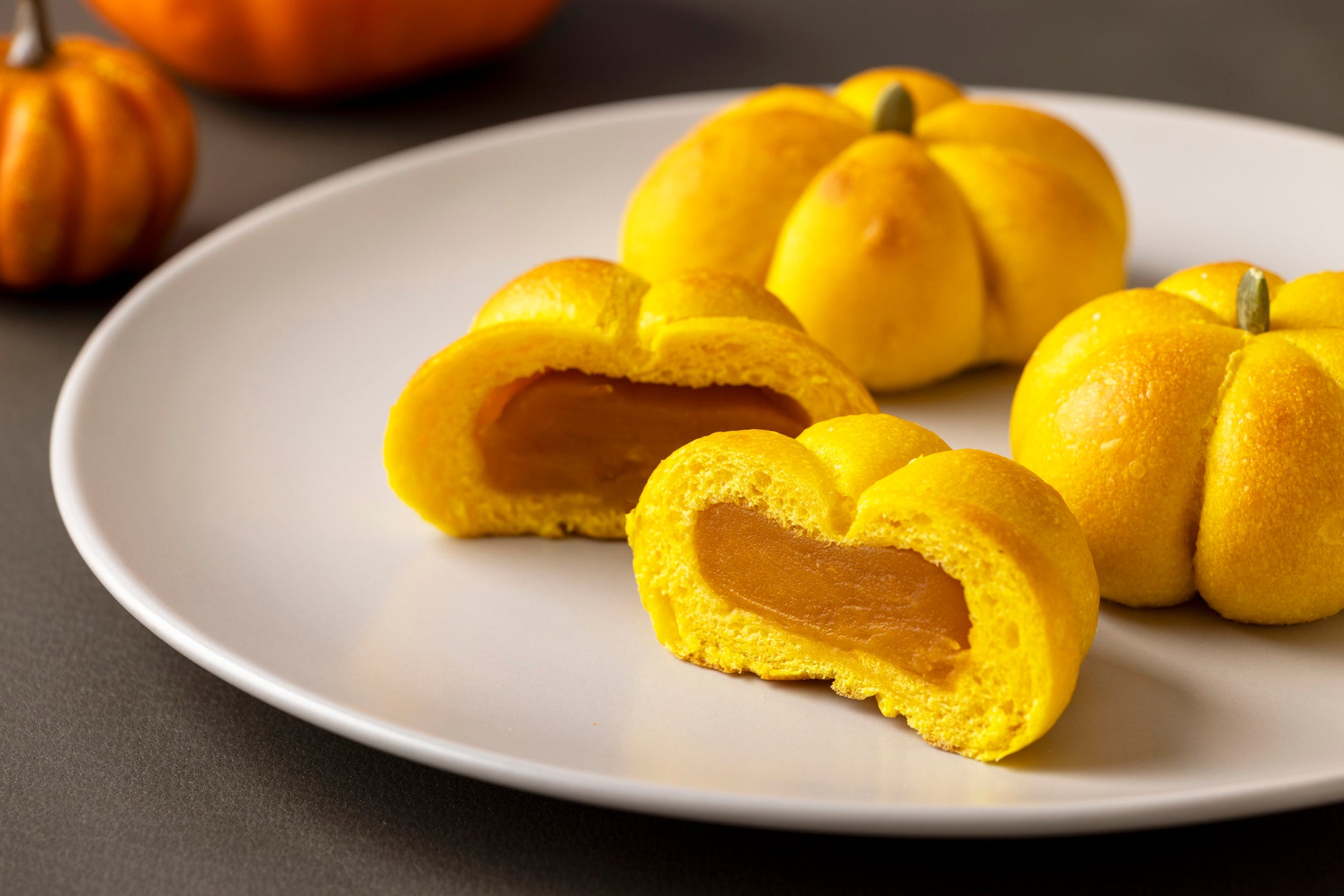 かぼちゃペーストを練り込んだ甘い香りのしっとり柔らかな生地に、素材本来の甘みを活かしたかぼちゃの餡をたっぷりと詰め込み、ころんとしたかぼちゃ型に焼き上げます。