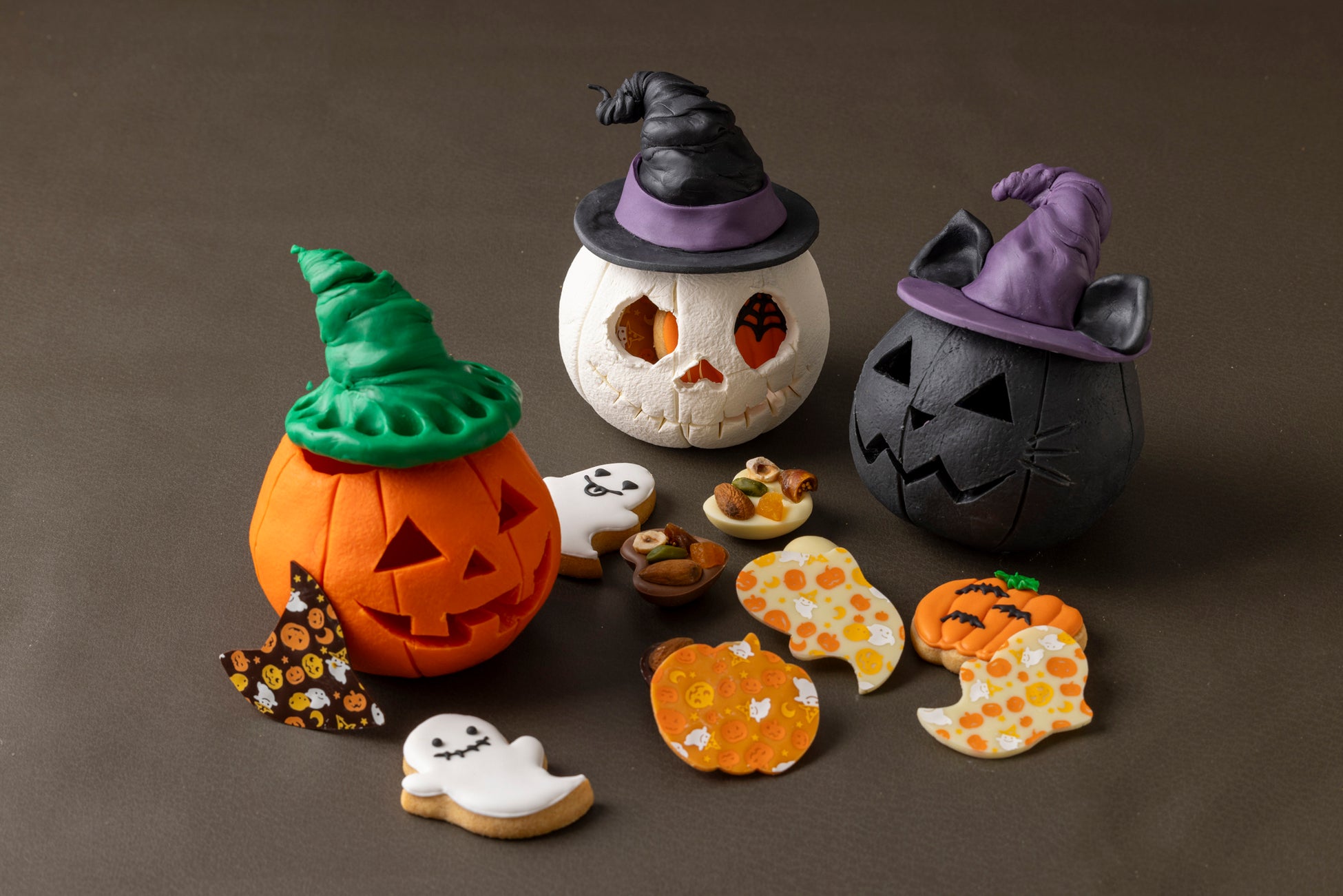 今年は、7種類のハロウィンスイーツと2種類のハロウィンブレッドをご用意いたします。スイーツでは、ハロウィンモチーフのプティフール(小菓子)を詰め合わせたアソートが新登場。薄いマシュマロをふんわりとかぶせゴーストを表現したチーズムースや、濃厚なパンプキンクリームにコウモリ型のチョコレートをデコレーションしたモンブラン、ぎょろっとした目玉がリアルなホワイトチョコレートのムースなど、細部にまでこだわった6種類のひと口サイズのスイーツをお楽しみいただけます。さらに、毎年ご好評をいただいている、ハロウィンモチーフのお菓子を詰め込んだチョコレートでつくる全部食べられるジャック オ ランタンには、パンプキン、スカルに加え黒猫のモチーフを新たにご用意いたします。1枚ずつハンドメイドでつくり上げるアイシングクッキーでは、定番のハロウィンデザインのほかに、魔女の帽子やブラックドレス、ハイヒールなどのより細やかな新デザインもお目見えします。そのほか、紫芋、パンプキン、ピスタチオの3種類のフレーバーをお楽しみいただける、見た目にもキュートな「ハロウィン マカロン」や、ジャック オ ランタンやミイラなどのデザインがハロウィン気分を盛り上げる「ハロウィン ロリポップ」など、手土産やお子様へのギフトにおすすめの遊び心あふれるスイーツがラインナップいたします。ブレッドでは、ソーセージにブリオッシュ生地を巻き付け、ミイラの包帯を表現したユニークな新作のブリオッシュと、かぼちゃ型のあんぱんがそろいます。