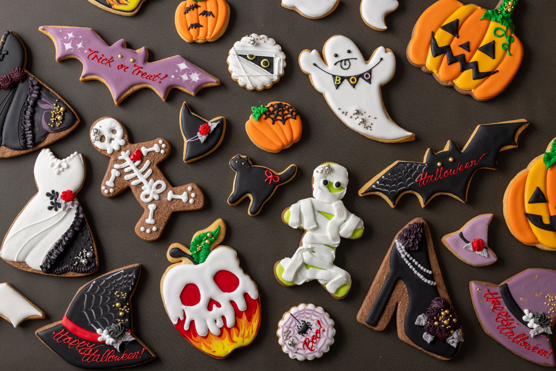 焼き上げからデコレーションまで1枚ずつハンドメイドでつくり上げる、ハロウィンモチーフのアイシングクッキーです。ジャック オ ランタンやゴースト、コウモリなどハロウィンの定番のデザインに加え、今年は魔女の帽子やブラックドレス、ハイヒールなどのより細やかなデザインが新登場。小サイズのアイシングクッキー4枚セットと、大サイズ1枚入りの2種類をご用意いたします。