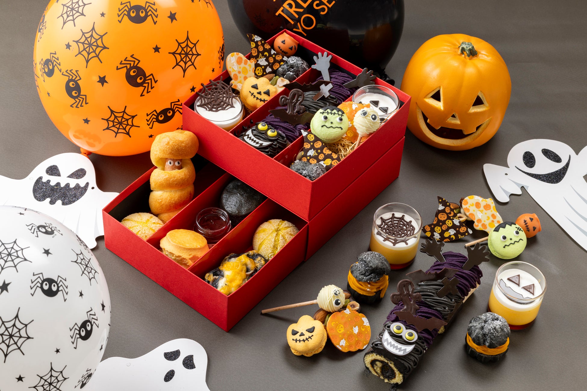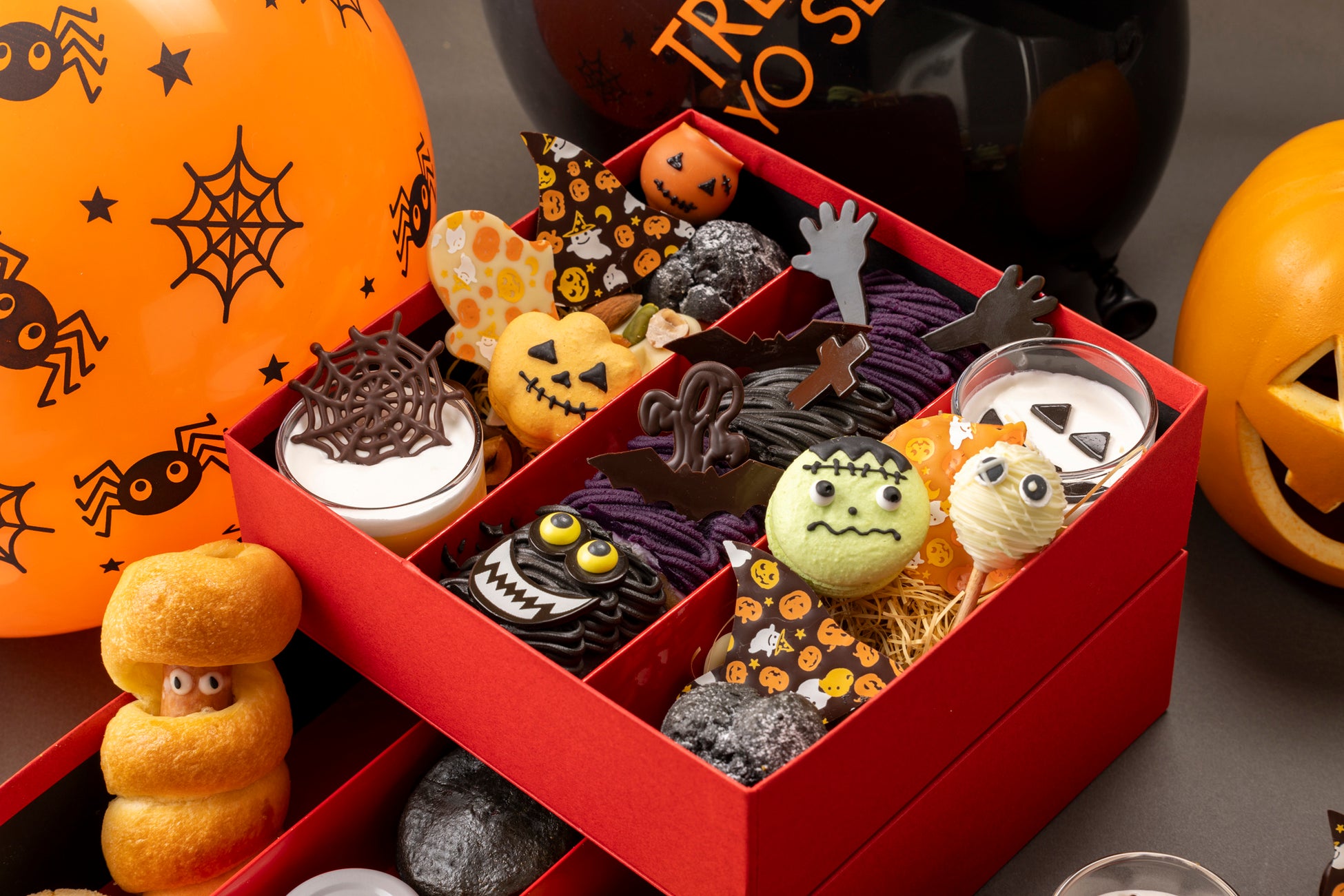 さらに、自宅でゆっくりと楽しむアフタヌーンティーやホームパーティーに最適な「ハロウィン アフタヌーンティー テイクアウトボックス」が今年も登場。パンプキンと紫芋の2種類のロールケーキをはじめ、クモの巣型のチョコレートを飾ったなめらかな口当たりのパンプキンプリン、フランケンシュタインをデザインしたピスタチオマカロンなど、オレンジやパープル、グリーンなど見た目にも賑やかなハロウィンスイーツとブレッドを詰め合わせました。ホームパーティーを盛り上げるバルーンなどのデコレーションもご一緒にご用意いたします。