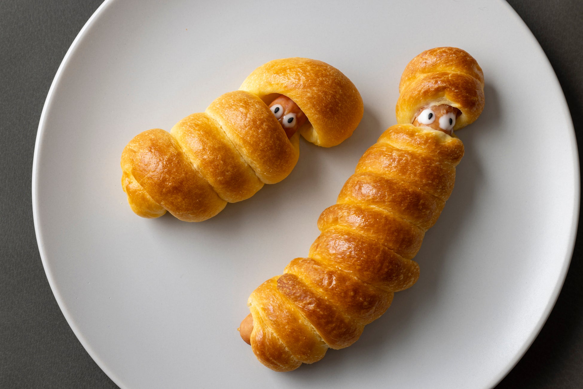 ソーセージにブリオッシュ生地を巻き付け、ミイラの包帯を表現したユニークな新作ブレッド。やさしい甘みのブリオッシュ生地とソーセージの塩味のバランスが絶妙な幅広い世代に愛される味わいです。大小2種類のサイズをご用意いたします。