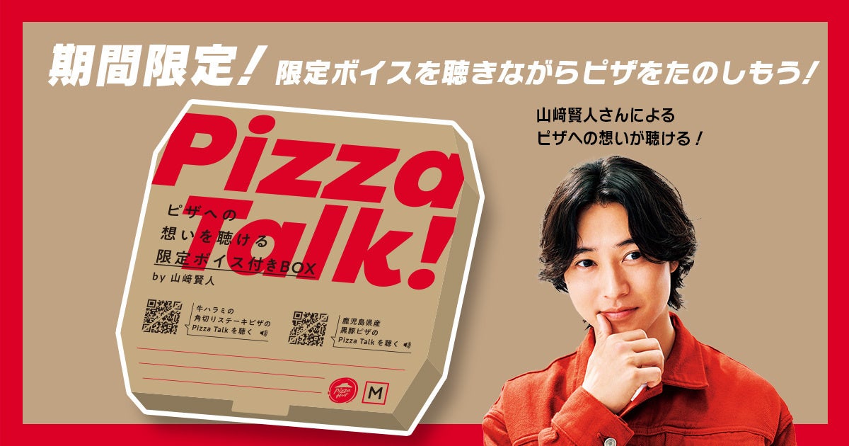 新商品「青森県産にんにく香る 牛ハラミの角切りステーキピザ」と「炭火香ばしい 鹿児島県産黒豚ピザ」の発売に合わせて、「ピザへの想いを聴ける限定ボイス付きBOX by 山﨑賢人」が登場。本BOXに印刷された2種類の二次元コードから「Pizza Talk!」特設サイトにアクセスすると、ここでしか聴けない山﨑さんの“ピザへの想い”をそれぞれ聴くことができます。CMでは語り切れなかった山﨑さんの“ピザ愛”を、音声を通してじっくりと堪能できる、“耳から味わう”特別なピザ体験をお楽しみください。