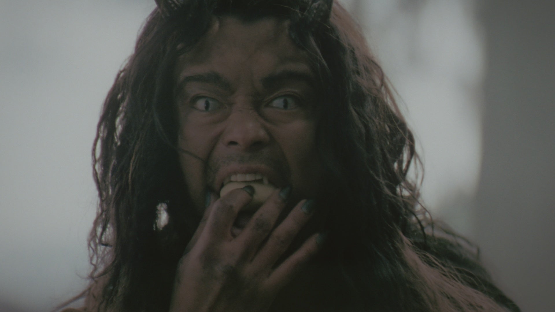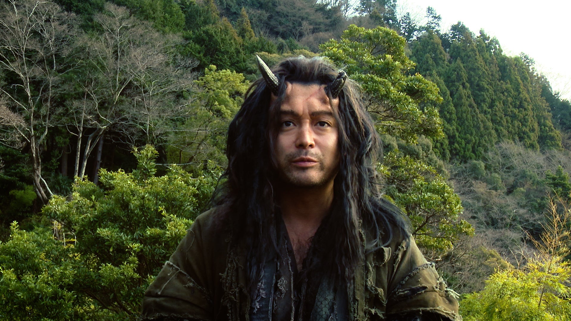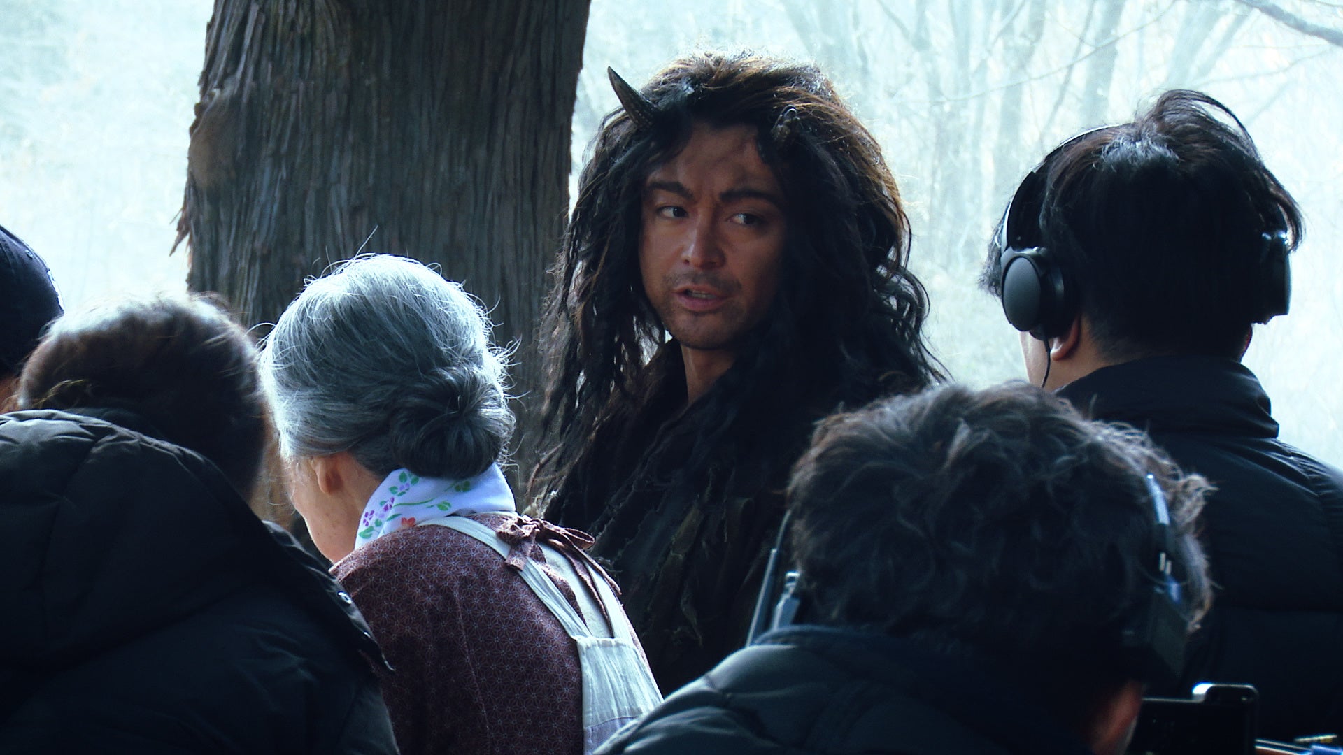 鬼がおばあさんの前に登場するシーンは必見。人にあらざる鬼が、突如空からおばあさんの前に飛び降りてくる様子を表現すべく、山田さんに大胆なワイヤーアクションに挑戦していただきました。また、鬼の心を動かすきっかけとなったおまんじゅうを食べる際、粗暴な鬼の表情に瞬間的に戻る山田さんの形相にも注目です。