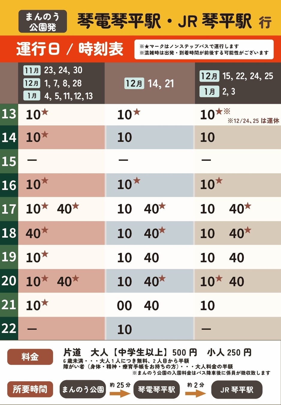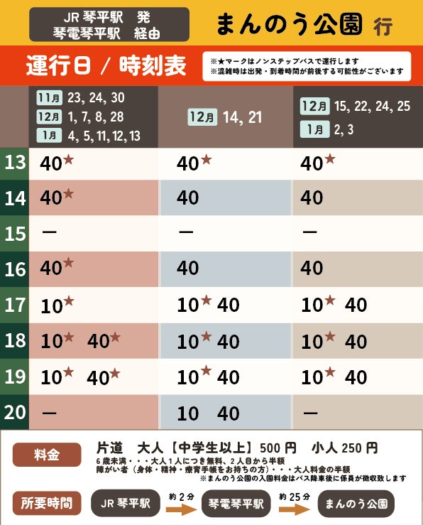 ウィンターファンタジー期間中の土日祝日および12/24、25、1/2、3 に、「JR琴平駅・ことでん琴平駅⇔まんのう公園」の有料送迎バスを運行します。