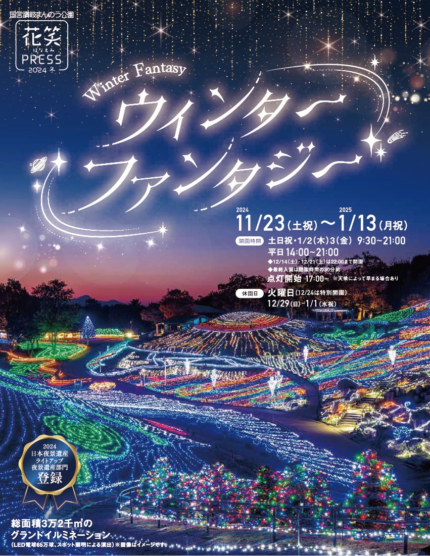 香川県にある国営讃岐まんのう公園では、2024年11月23日(土祝)から2025年1月13日(月祝)までの間、広大な夜の公園に幻想的な光の世界が広がる冬のイルミネーションイベント「ウィンターファンタジー」を開催中。