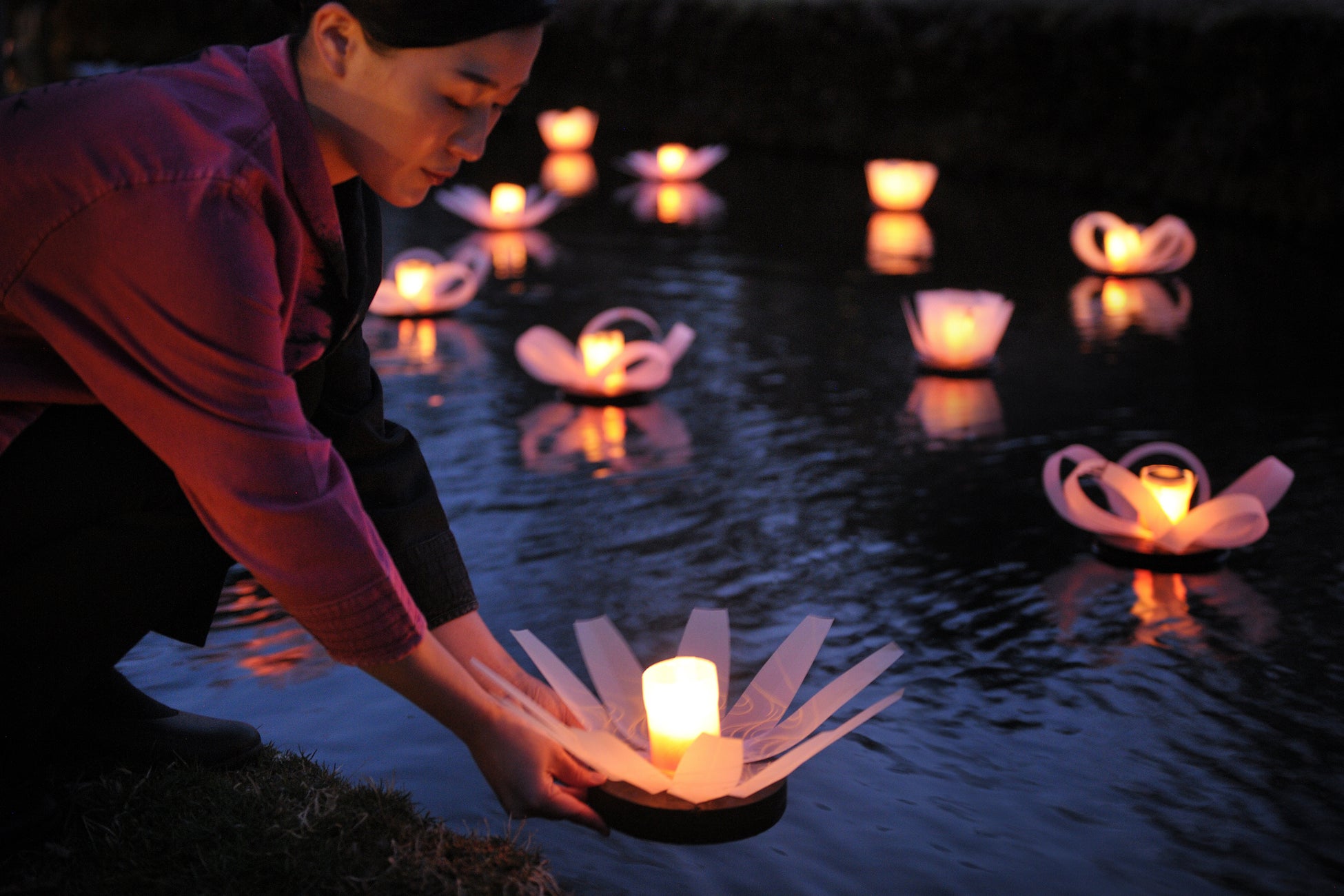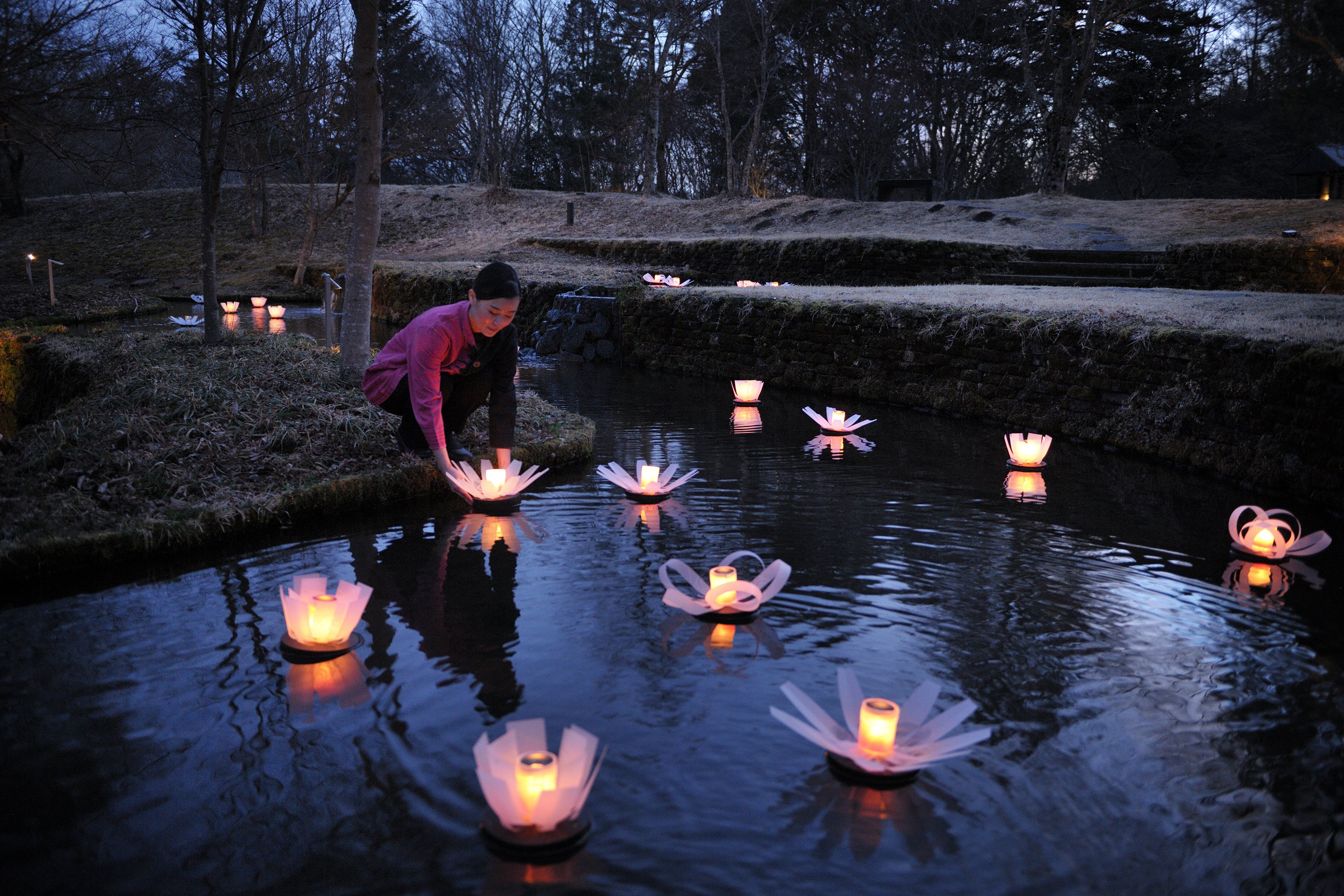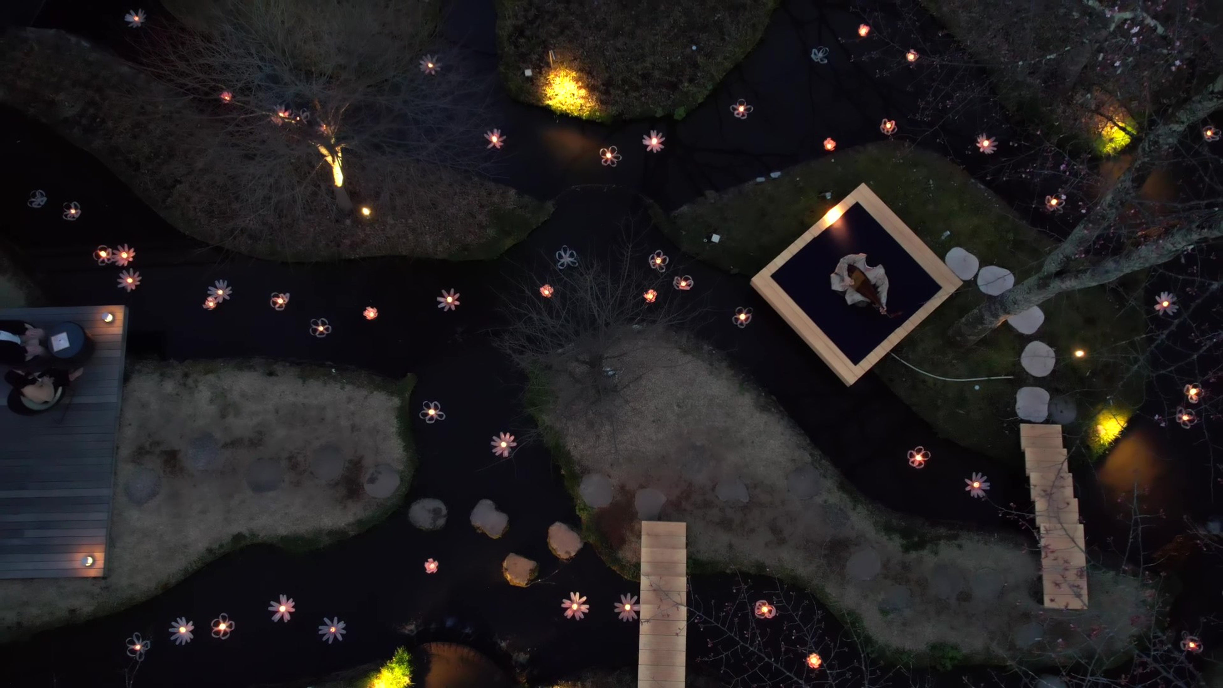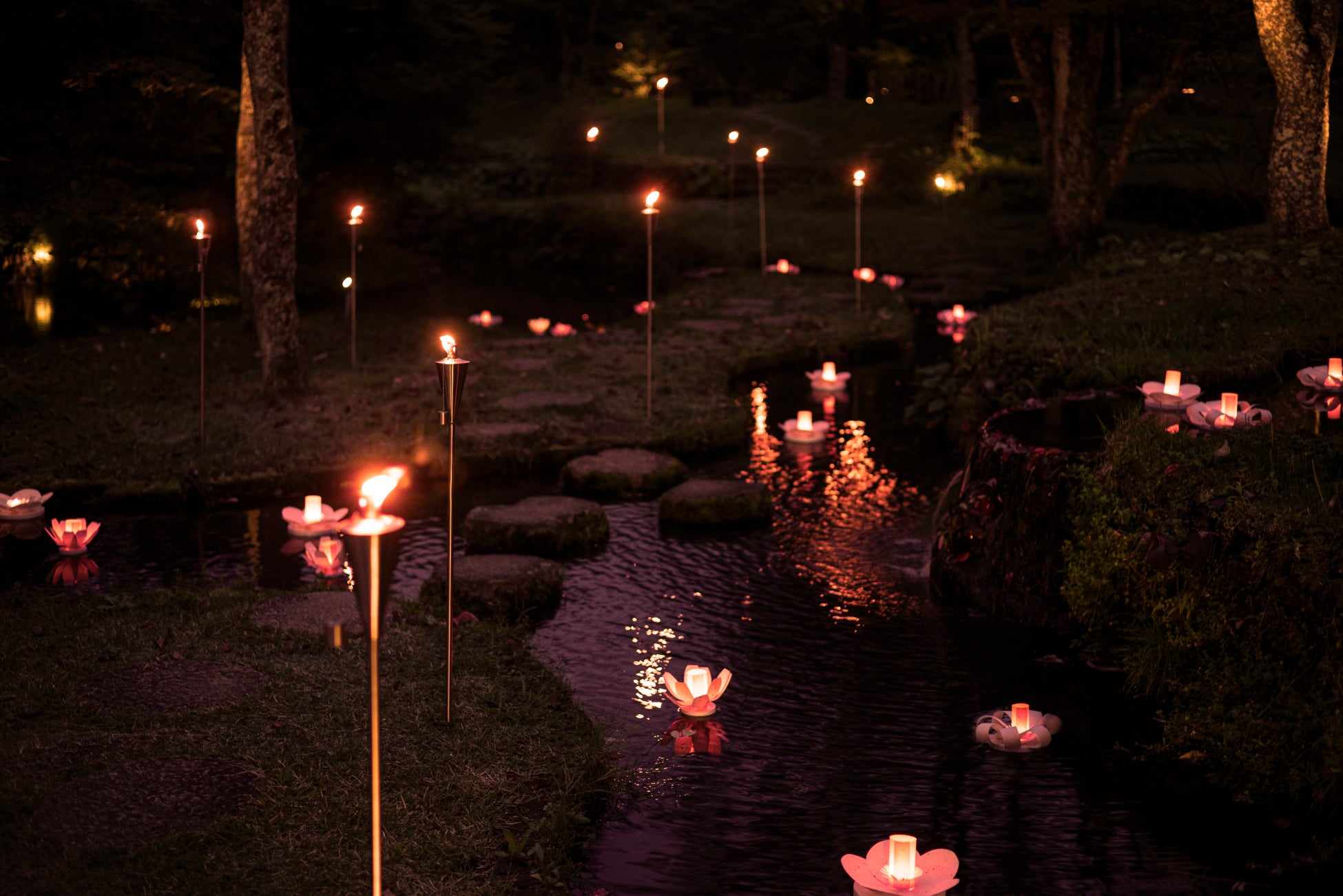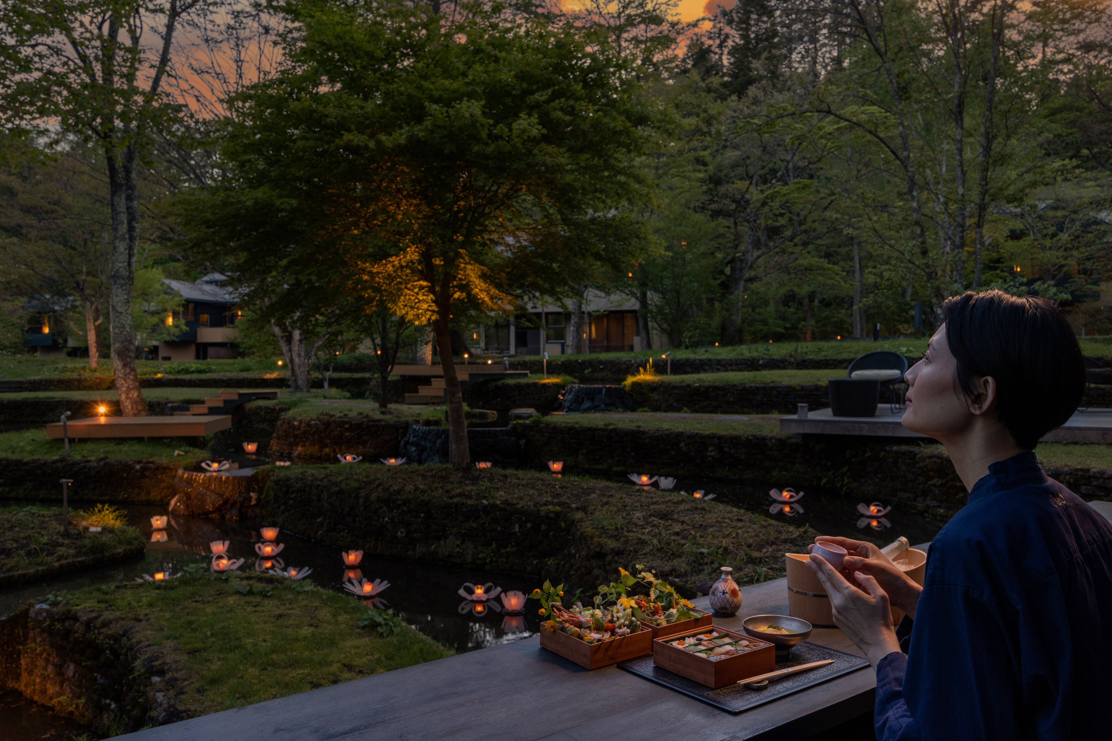 夕暮れ時に、星のや軽井沢を象徴するランドスケープである棚田に、野花を模した約300個の花行燈を浮かべます。モチーフにしたのは、春になると星のや軽井沢の敷地内に咲く花「フクジュソウ」「ルリソウ」「アズマイチゲ」の3種類です。毎日スタッフが手作業で花行燈のろうそくに火を灯します。まるで水面に花が咲いているかのように浮かぶ花行燈と、心温まる火の揺らぎが、幻想的な空間を創り出します。さらに今年は、日中にも花見を楽しめるように花行燈のデザインを一新しました。蕾のような印象の日中の姿から、ろうそくが灯されることで夜には花が開いたような印象に変化する、冬から春への移り変わりを表現した花行燈です。棚田の時間の経過と共に変化する花行燈が創り出す空間が、時の移ろいに浸る心安らぐ時間を演出します。