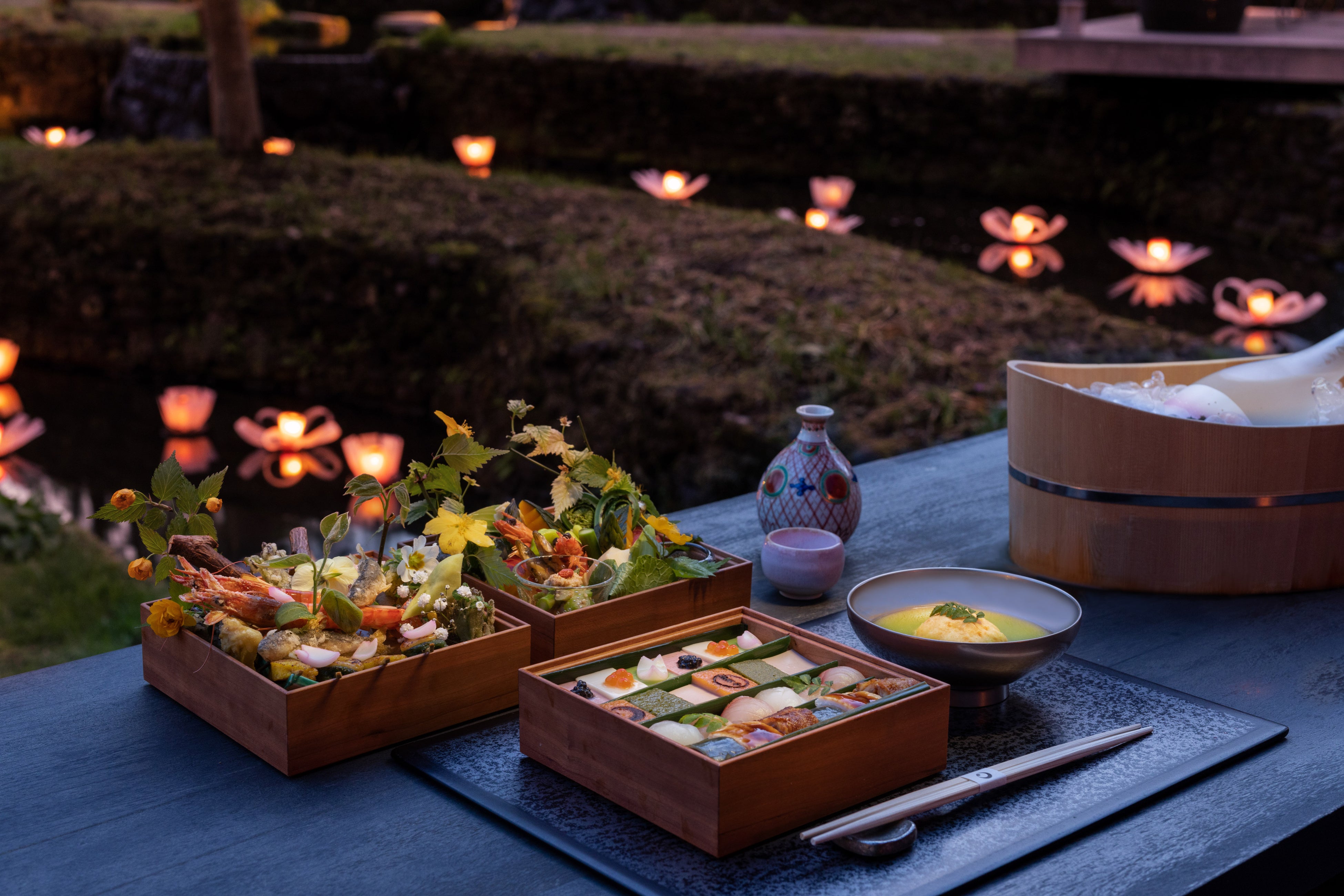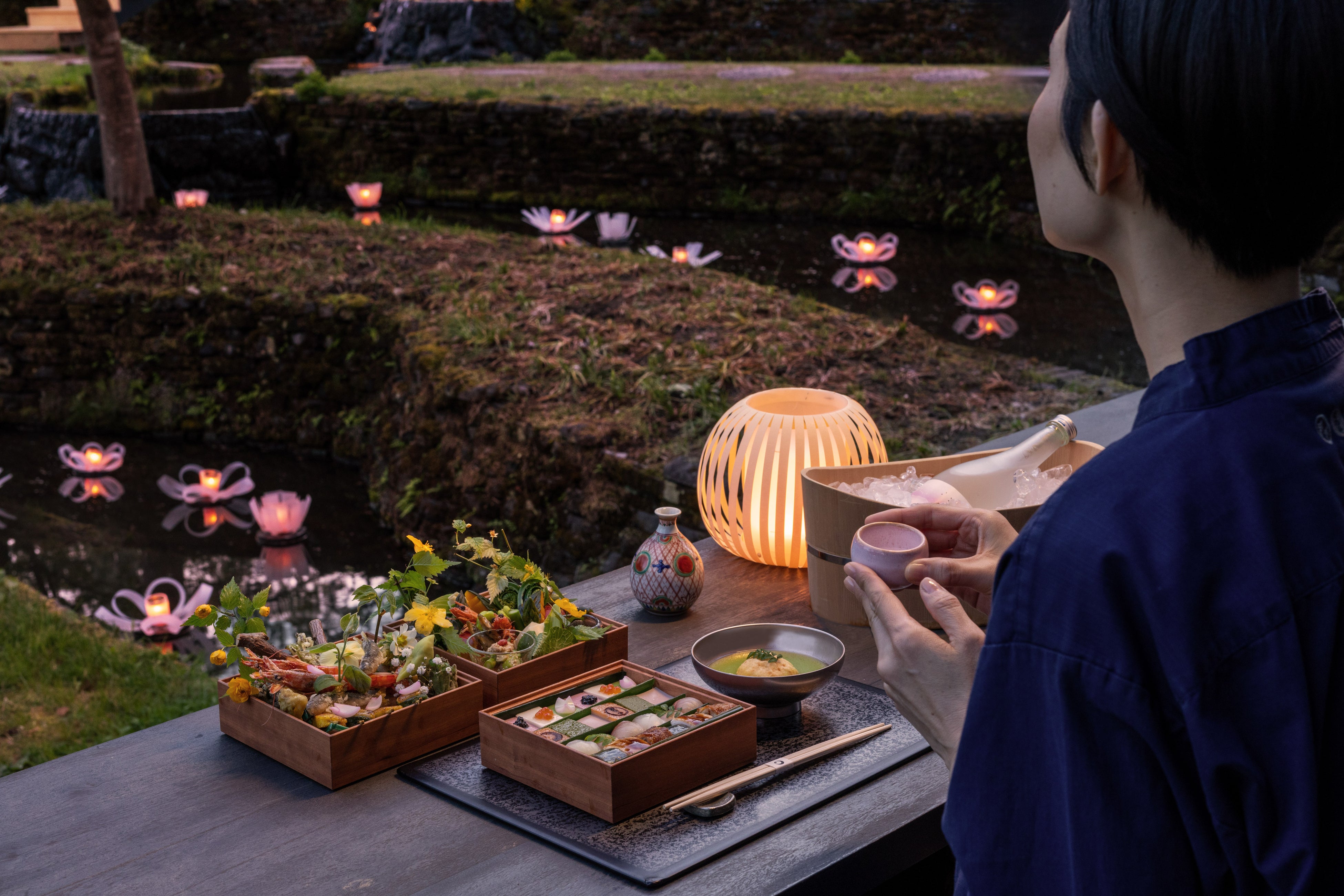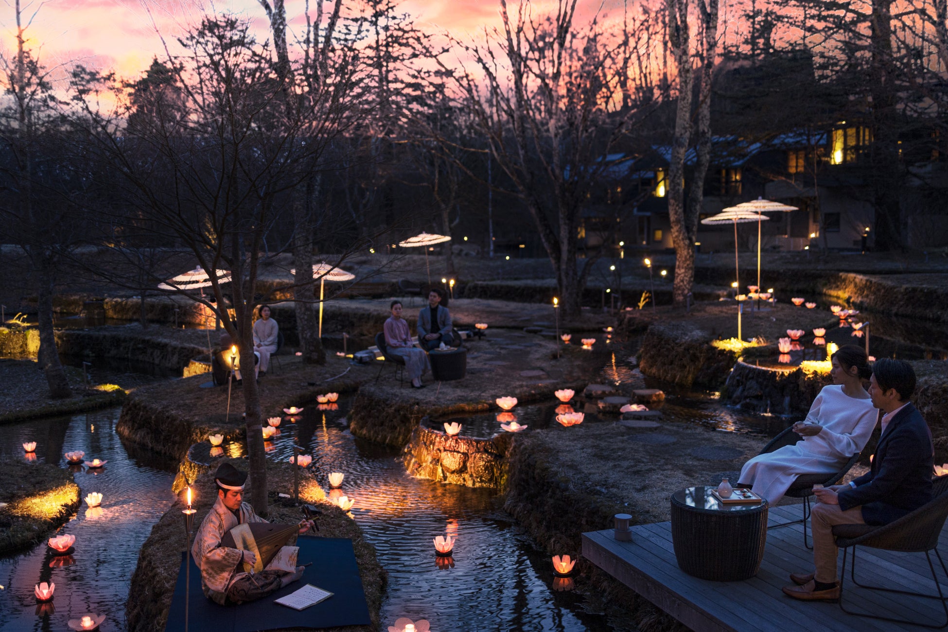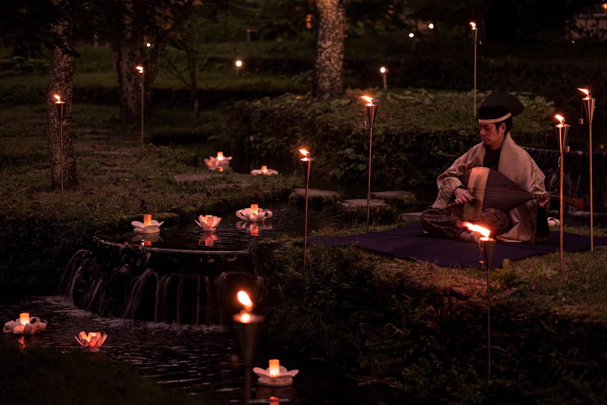 花行燈が浮かぶ幻想的な空間にて、催し開催期間中の週末限定で雅楽の生演奏を行います。雅楽とは、元来自然との調和を最上の趣とする音楽でした。星のや軽井沢は、浅間山麓の自然に囲まれた山あいにあり、四季折々の自然の音を聞くことができます。棚田は、流れる水のせせらぎや野鳥のさえずり、時折吹き抜ける風の音など、自然が織りなす音を体感できる空間です。その自然の音色と調和するように、楽人が笙や琵琶の演奏をします。今年は花行燈の浮かぶ棚田の情景や宴の昼夜の変化に合わせ、昼には春を呼び込む曲目、夜には春の到来を寿ぐ曲目と、趣の異なる雅楽の生演奏を楽しめます。花行燈が創りだす情景に、自然の音と調和した雅楽の趣ある音色が加わり、よりいっそう神秘的かつ幻想的な空間を演出します。