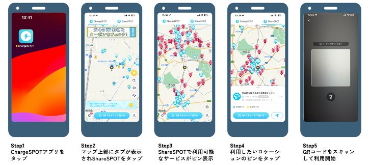 ChargeSPOTアプリを開くと、画面上部に新たに「ShareSPOT」のタブが表示されます。このタブをタップすると「ShareSPOT」で利用可能な参画サービスが地図上にピンで表示。利用したいロケーションのピンをタップし、QRコードをスキャンすることでユーザーは希望するサービスが利用できます。