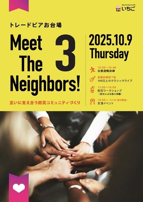 ⼼を込めて現存不動産に新しい価値を創造する、⼼築(しんちく)を軸とした事業モデルを展開しています。いちごが保有する大規模オフィスビル「トレードピアお台場」にて、テナント様や近隣の皆さまをつなぐ「お隣り同士の交流会」として、Meet The Neighbors!というイベントを2025年10月9日に開催しました。