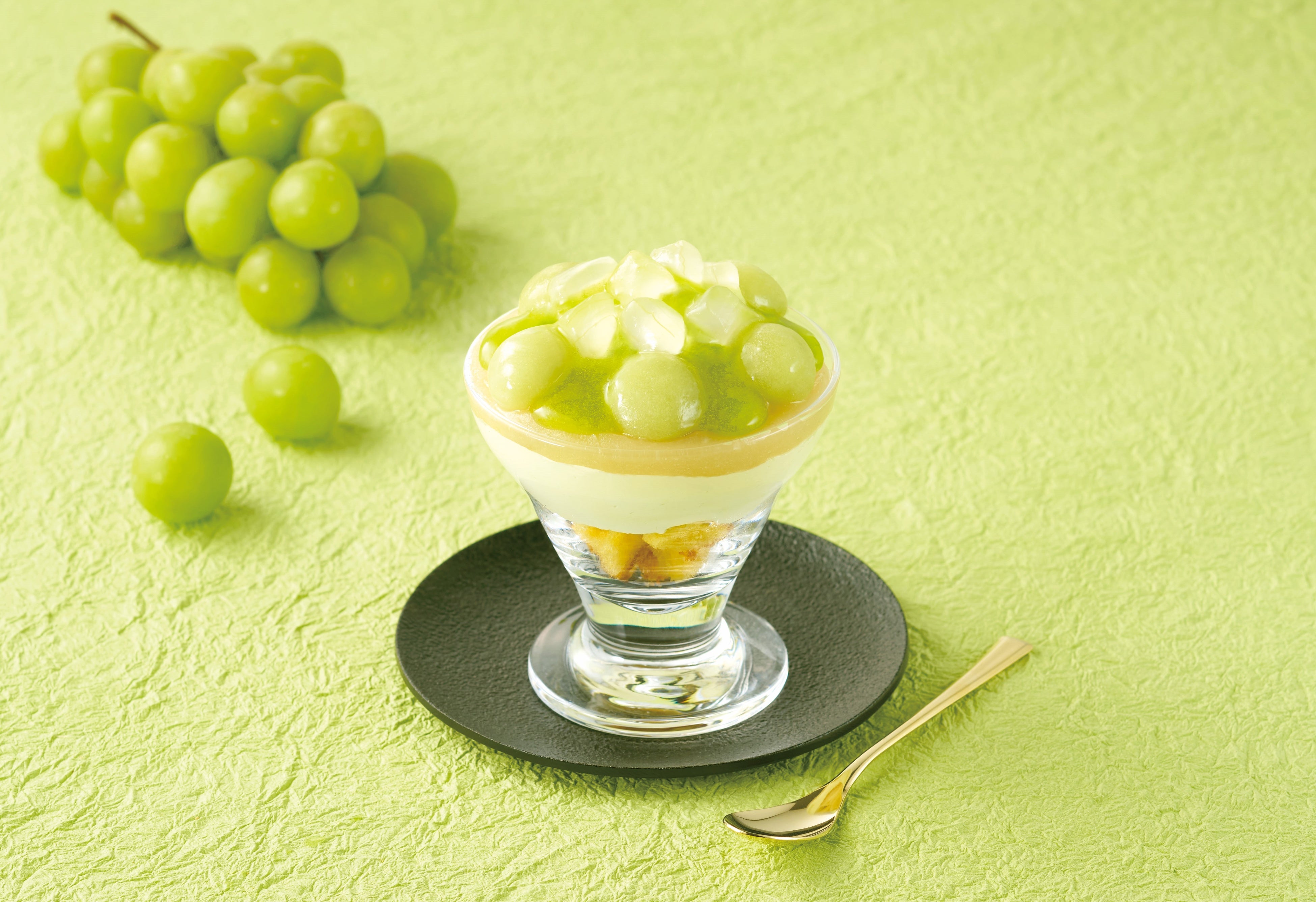 マスカット大福の味わいをイメージした、見た目も華やかな5層構造の“パフェアイス”