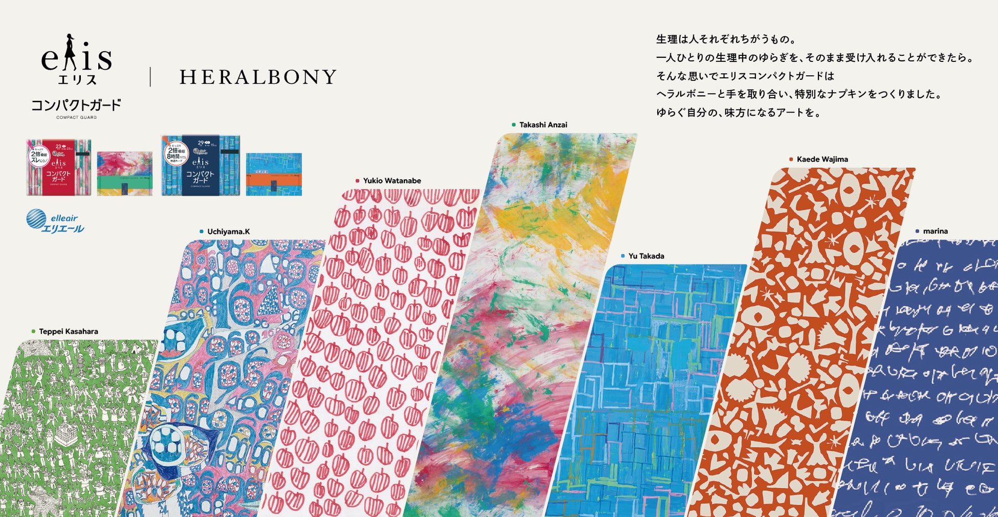株式会社ヘラルボニーは、衛生用紙製品No.1ブランド※1の「エリエール」を展開する大王製紙株式会社(本社:東京都千代田区)とコラボレーションし、ヘラルボニーがライセンス契約を結ぶ7名の異彩作家のアート作品が、生理用ナプキン・エリスの個包装デザインに起用されました。コラボレーション商品「エリス コンパクトガード ヘラルボニー企画品」(全7商品)は2024年6月1日(土)より数量限定で全国の量販店やドラッグストア、ECサイトなどで発売されます。
