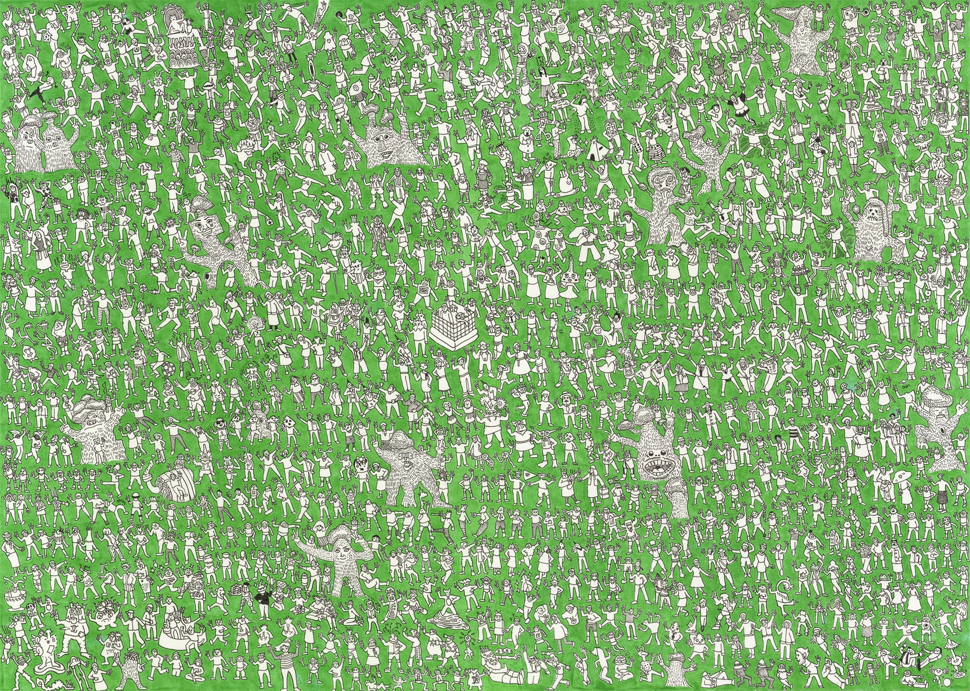 彼が真っ白いキャンバスに表現するのは、0.03から0.7mmまでのペンで描く唯一無二の個性豊かなキャラクター達。それぞれ表情や格好が違い、画面の中で踊っているように表現される。