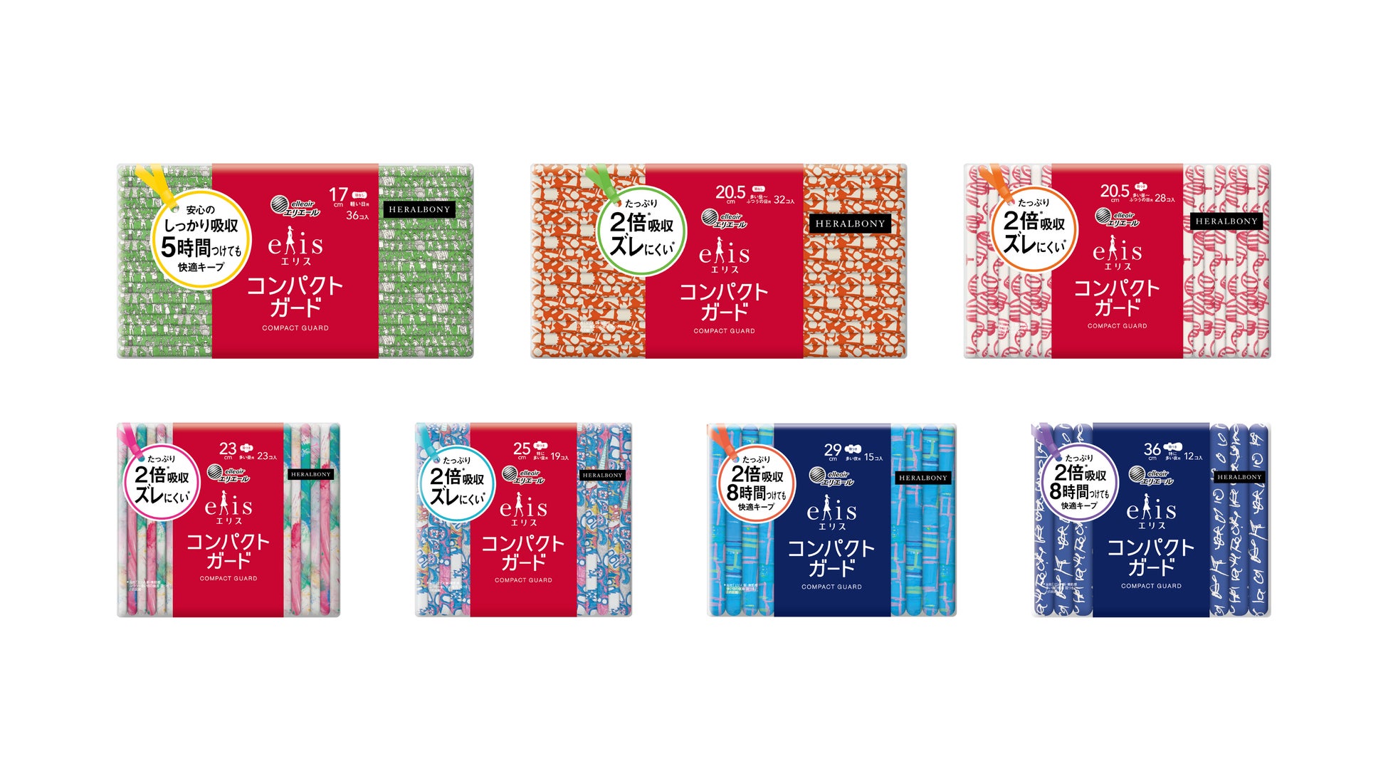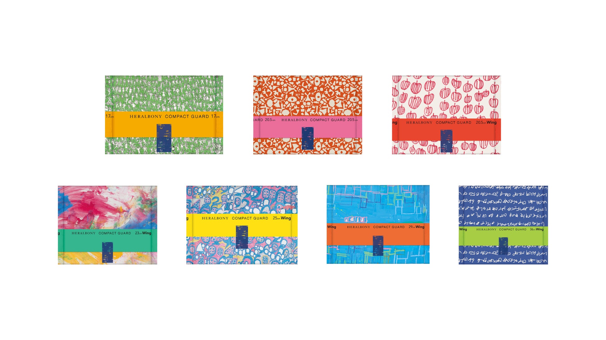 「エリス コンパクトガード」は、”魅せるデザインで生理中の気分を上げる”ことをコンセプトに、カラフルなデザインとわずか1.9mmの極薄シートながらも従来のナプキンの2倍吸収※2を実現させ、機能性とデザイン性を兼ね備えた超スリムタイプの生理用ナプキンです。今回、ヘラルボニーがライセンス管理をする2,000点のアート作品の中から、従来のコンパクトガード(7商品)のカラーイメージに合った異彩作家7名の作品を選出し、個包装に採用しました。持っているだけで気持ちが上向きになるようなカラフルなデザインで、憂鬱になりがちな生理中の気分を高めてくれます。