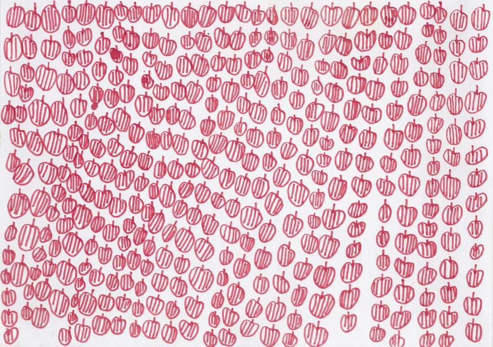 現在はグループホームに所属しており、作品の多くは以前の施設に入所していたときに描かれたもの。その時思い描いたモチーフを表現することが多く、画用紙や数字練習ノートに敷き詰められるように書かれた「りんご」は、本人にタイトルを尋ねると「すいか」と答える日もある。趣味は映画を見ること。音楽を聴くこと。
