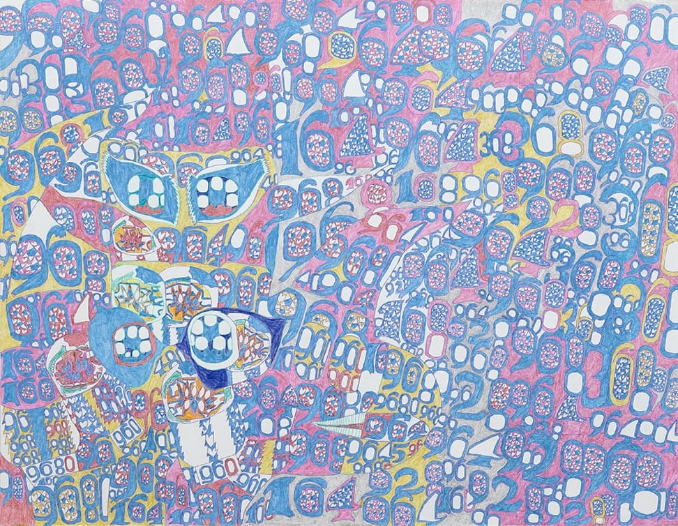 100種類以上の0.5ミリペンで描かれる「〇〇の地図」シリーズは、まるで細胞が増殖するように数珠繋ぎでモチーフが描かれ、そのあまりの綴密さに思わずため息が漏れてしまう。普段は人見知りで寡黙な彼だが、作品紹介を振られると普段の姿からは信じられないほど流暢に語る一面があり、それがなんとも愛らしい。
