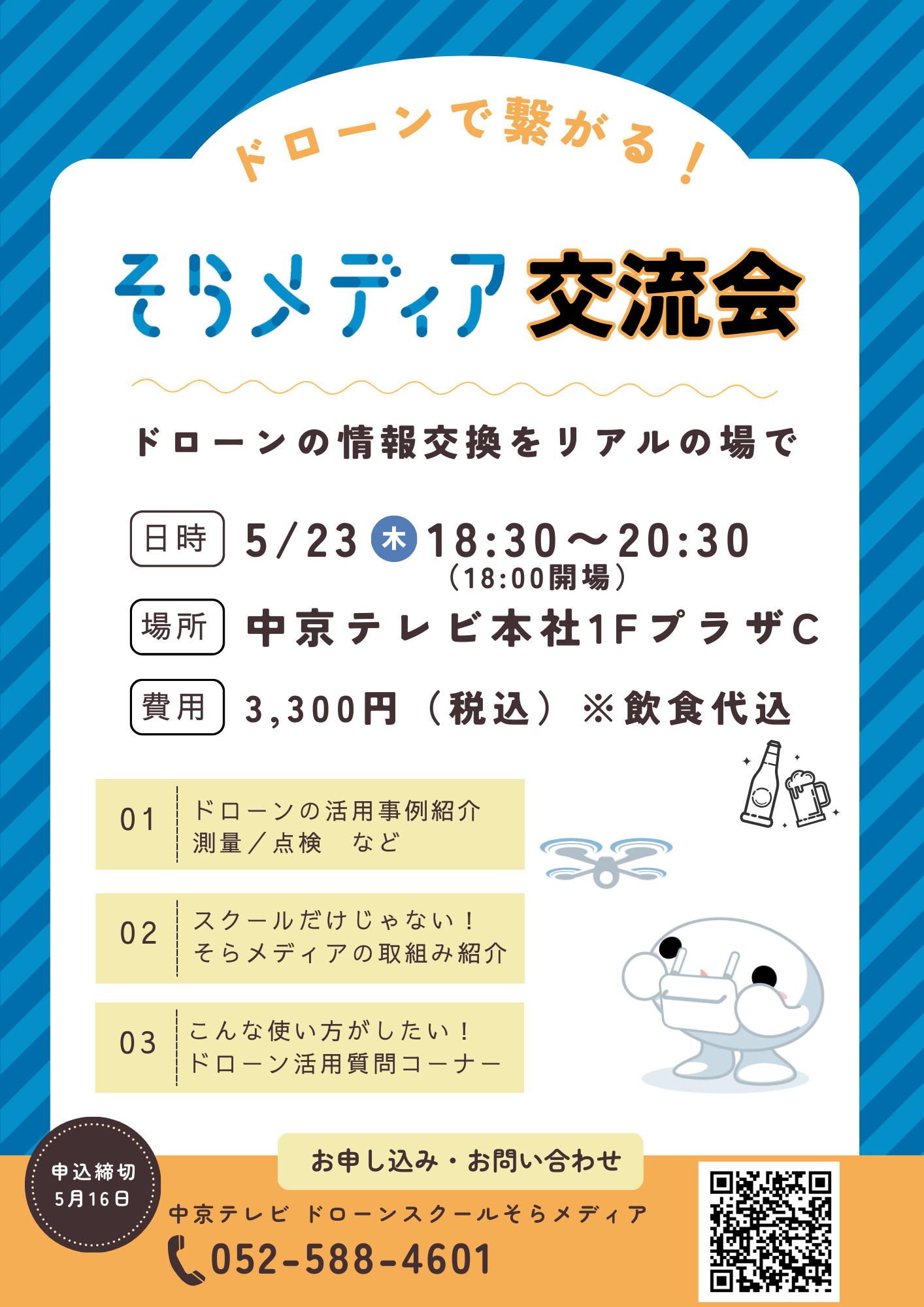 中京テレビ放送株式会社(本社:名古屋市中村区 代表取締役社長:伊豫田 祐司)のドローンスクール「そらメディア」は、5/23(木)に中京テレビにてドローン交流会を実施することをお知らせいたします。