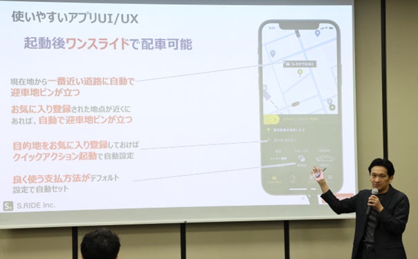 タクシーアプリ「S.RIDE」とは、ソニーグループとタクシー事業者のジョイントベンチャーが提供している、ソニーのAI/IT技術と決済システムが組み込まれたタクシー事業者と共同運営しているアプリケーションです。東京を中心とした都市圏の、タクシーのヘビーユーザによく使われておりであり、時間を効率的に使いたい多忙なビジネスパーソンと、法人契約をターゲットにしたタクシーアプリ配車サービスです。