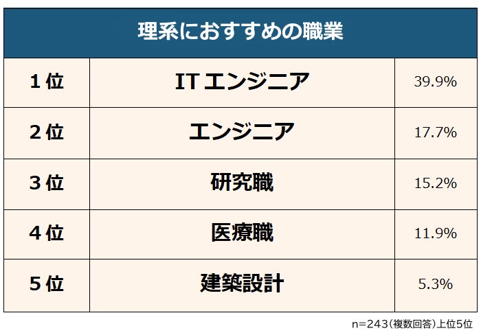 理系出身者243人に「理系におすすめの職業」を聞いたところ、圧倒的1位は「ITエンジニア(39.9%)」でした。2位「エンジニア(17.7%)」、3位「研究職(15.2%)」と続きます。