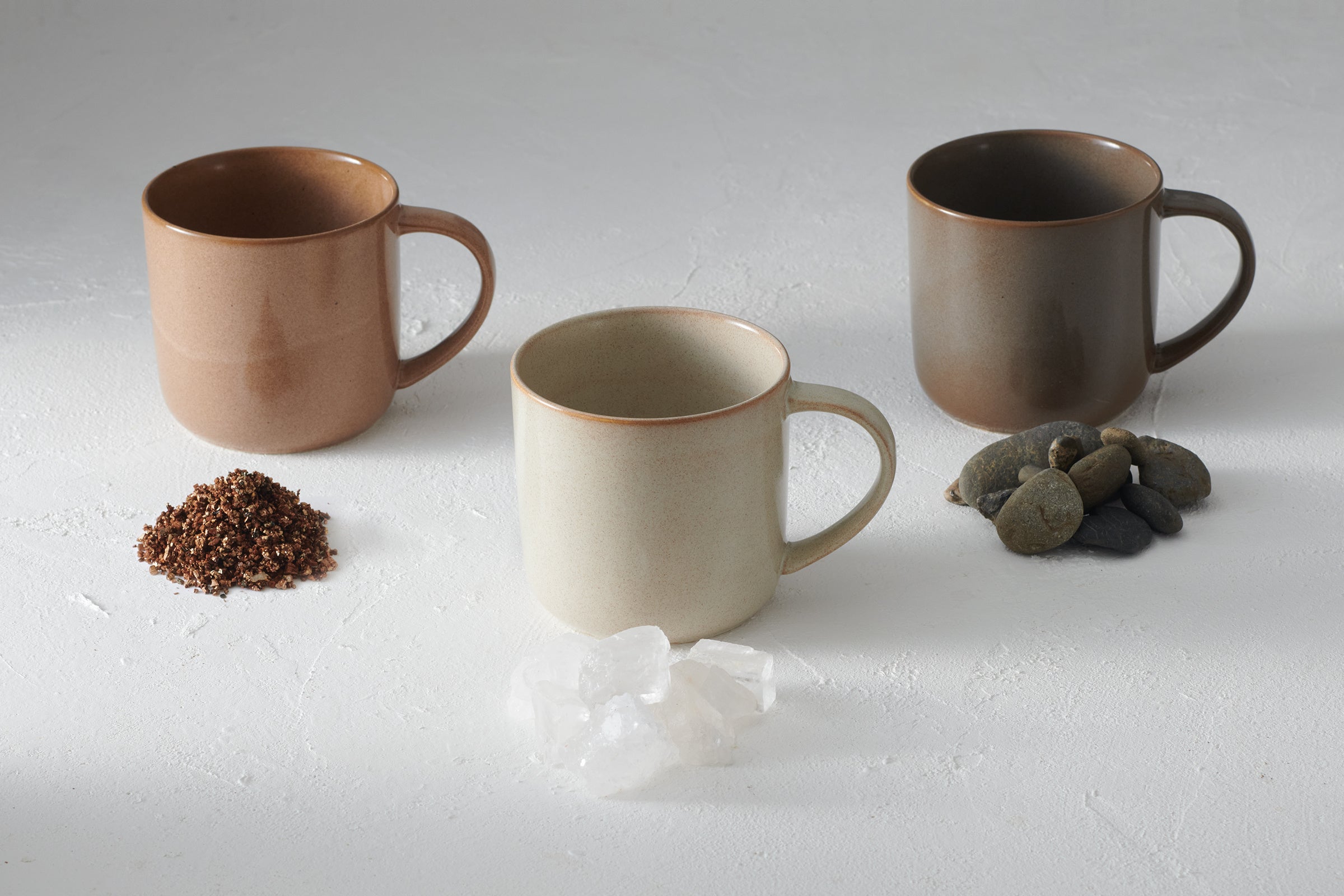 KEYUCAではこれまで色合いや質感にこだわった食器を展開してきました。「Landリサイクルマグ」も食器が好きなお客様にも喜んでいただけるよう、釉薬にこだわっています。シンプルなワンカラーのようで、複雑に色が混ざり合う表情がひとつひとつ違って面白く、店頭ではお好み商品をお選びいただけます。また、未来に残したい豊かな大地から着想を得たカラーリングもポイントで、ブラウンは「土」、グリーンは「クリスタル」、グレーは「石」をイメージしました。