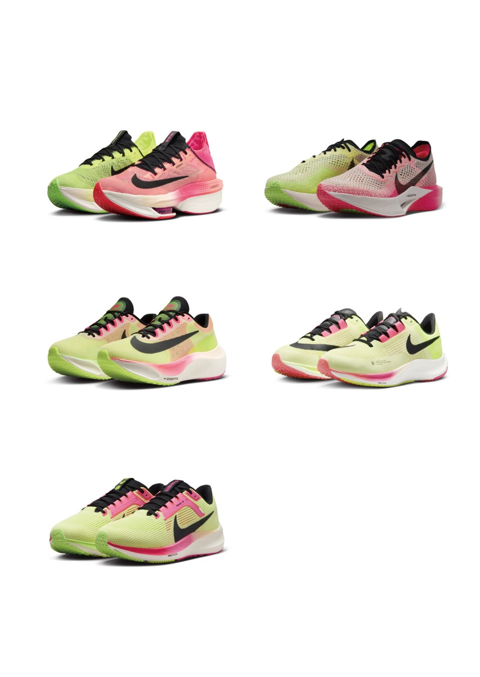 ※写真、向かって上段左 ナイキ エア ズーム アルファフライ ネクスト% FK2、上段右 ナイキ ズームX ヴェイパー フライ ネクスト% FK2、中段左 ナイキ ズーム フライ 5、中段右 ナイキ ズーム ライバル フライ 3、下段左 ナイキ エア ズーム ペガサス40 PRM