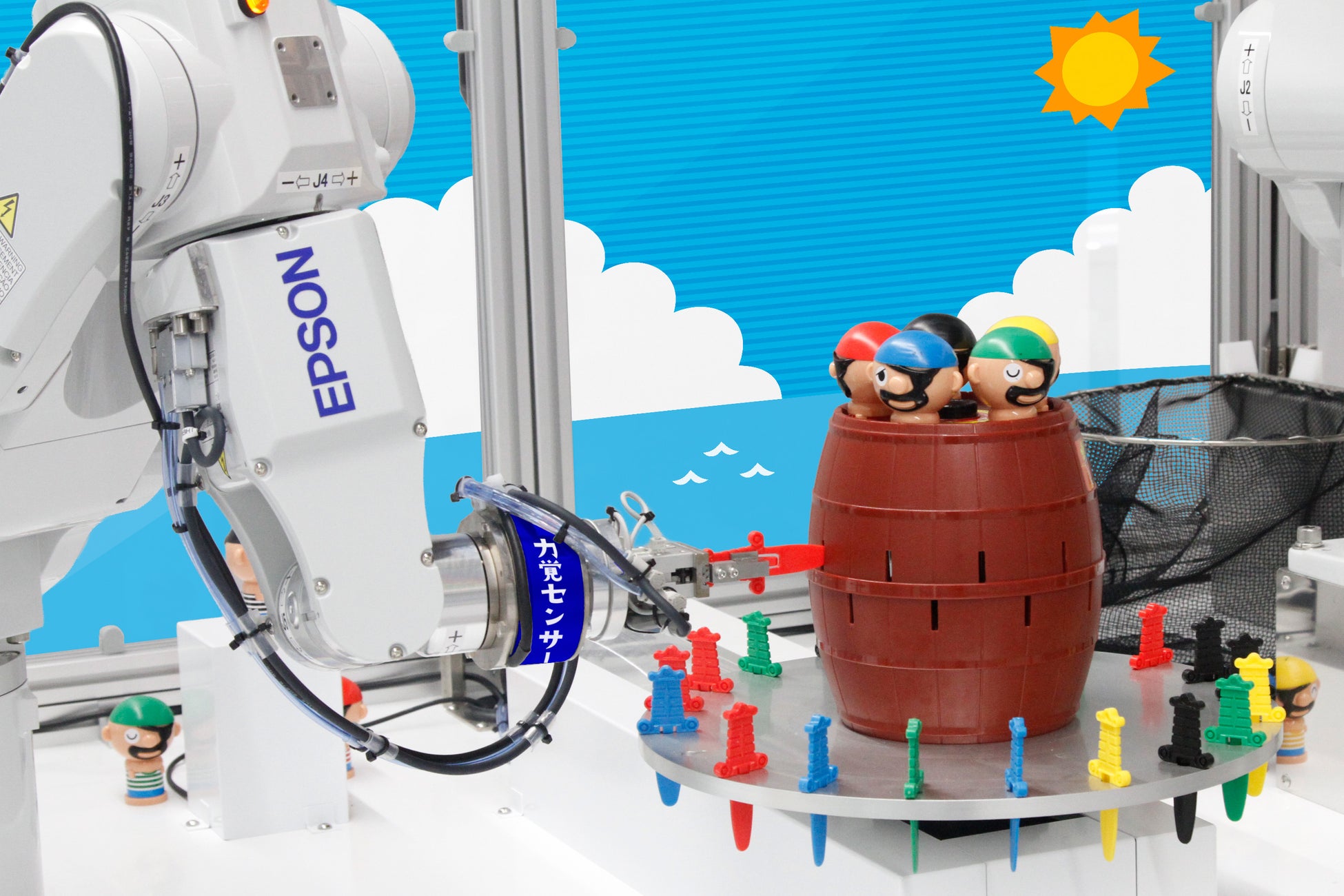 今回、エプソンは、2023年に東京ビッグサイトで開催された「2023国際ロボット展」で大きな反響を呼び、多くのメディアに取り上げられた装置『熟練技の自動化 黒ひげ危機一発* ロボット&力覚センサーに挑戦!』を出展します。