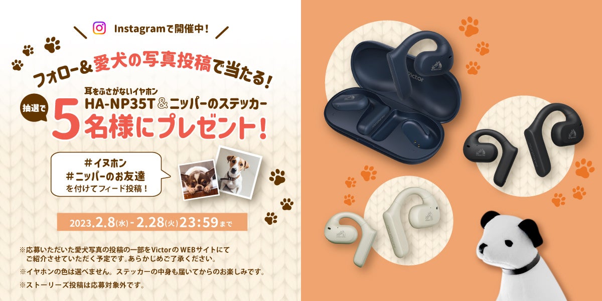 Victorブランド公式Instagramアカウント(@victor_sound_jp)をフォローし、愛犬の写真を投稿していただいた方の中から、抽選で5名様に耳をふさがないイヤホン「HA-NP35T」とニッパーのステッカーをセットで5名様にプレゼント。