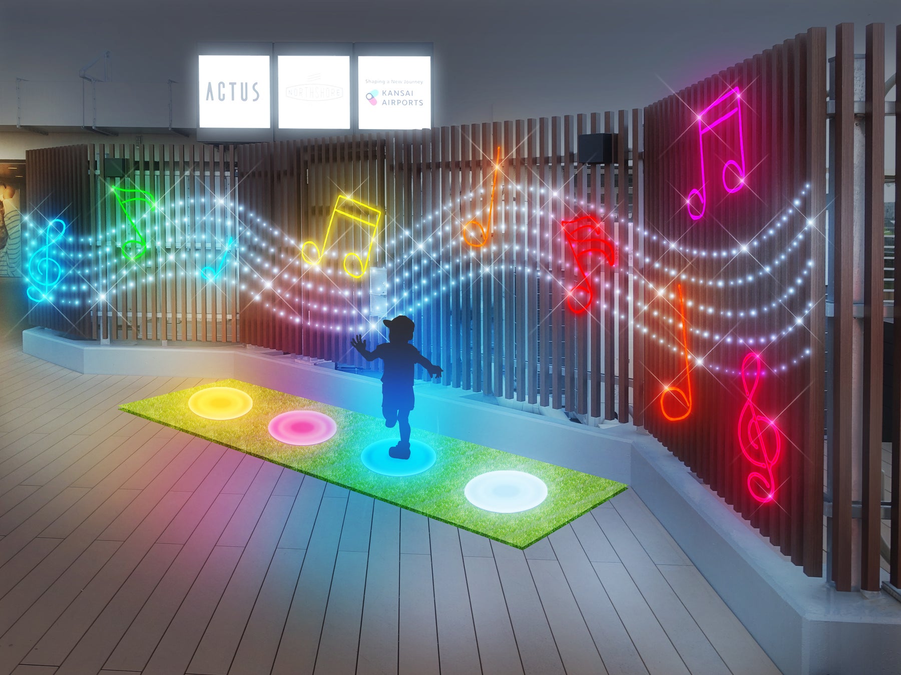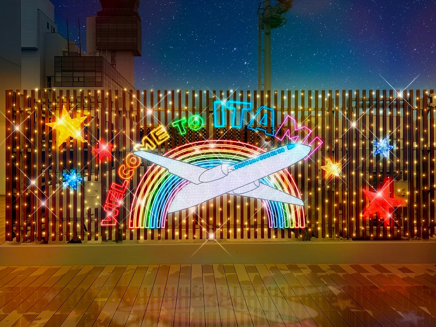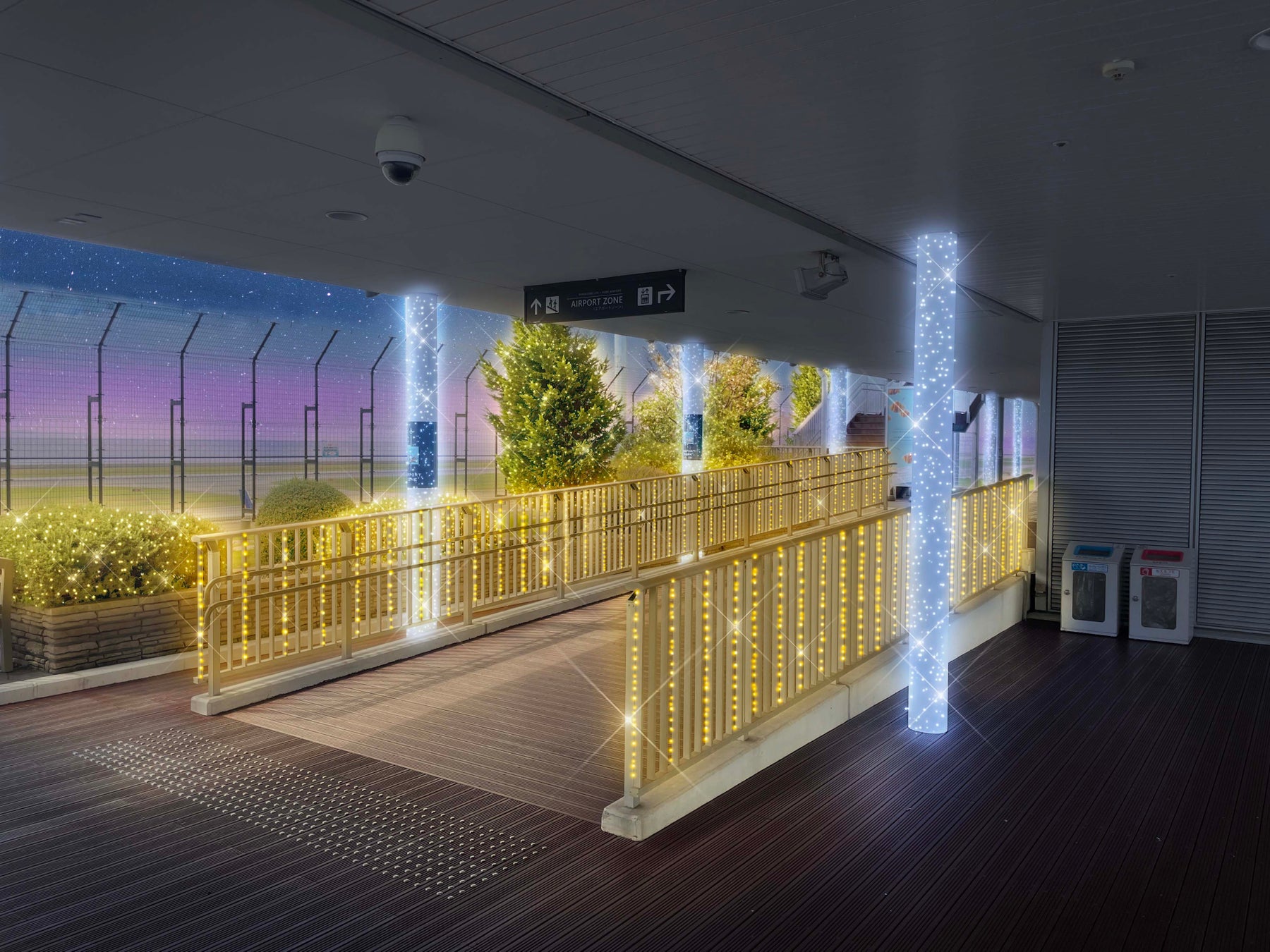 内容:「HAPPY TRIP」をテーマに、昼も夜も、お子さまから大人の方まで空港に訪れる全てのお客さ まの思い出に残るような演出とともに、カラフルな10万球以上の輝く光でお迎えします。踏むとさまざまな音が鳴る「サウンドストーン」などを取り入れた心躍るテーマパークのような空間をお楽しみください。
