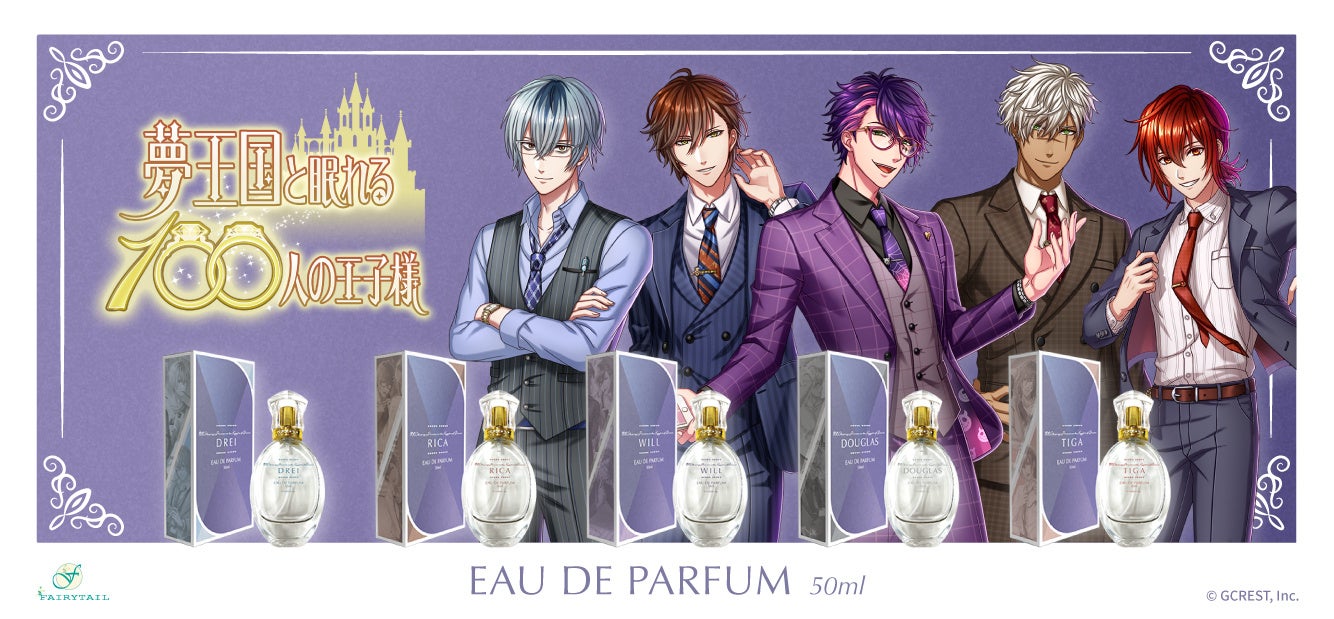 女性向けスマホパズルRPG『夢王国と眠れる100人の王子様(夢100)』よりリカ、ダグラス、ウィル、ティーガ、ドライの5人の王子をイメージした香水が登場!9月8日(金)より予約発売開始いたします。