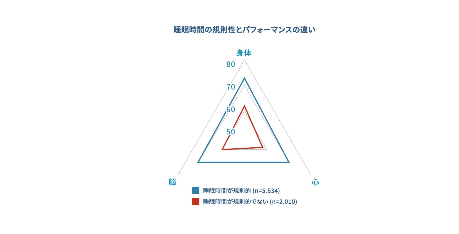 睡眠時間の規則性とパフォーマンス指標(身体・心・脳)を比較したところ、規則的な群は不規則な群に比べて、身体・心・脳のスコアがいずれも高いことが示されました。さらに、睡眠時間別に比較したところ「7〜8時間」の睡眠を「規則的」に確保している層が、すべての項目において最も高いスコアを示しました。睡眠が不規則な層や、規則的であって睡眠時間が極端に短い/極端に長い層では、パフォーマンスが低い傾向がみられました。