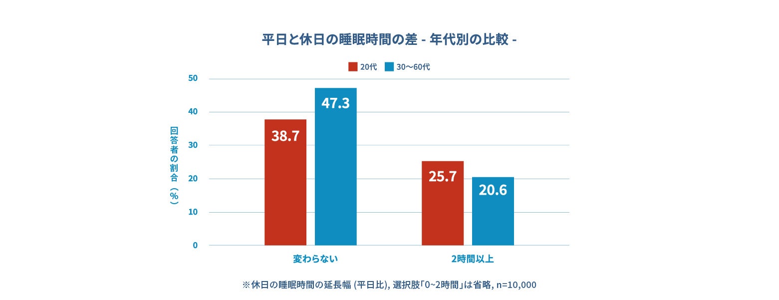 20代は全世代において、唯一平均睡眠時間が7時間超え、”睡眠優等生”の姿がみられました。その背景としては、忙しい時でも睡眠時間の確保を優先する方が多く、睡眠関連の情報収集や就寝前の行動調整、睡眠のための時間やお金の投資に前向きなことなど、睡眠を「自己管理すべき資源」として捉える意識の高さが顕著に表れています。一方、起床時間が平均的に遅めであること、また、平日と休日の睡眠時間の差が大きく、平日と比較して2時間以上長いその結果から、量(睡眠時間)は確保している一方で、週末の寝だめに依存するといった不安定な睡眠リズムを抱えていることも明らかになりました。