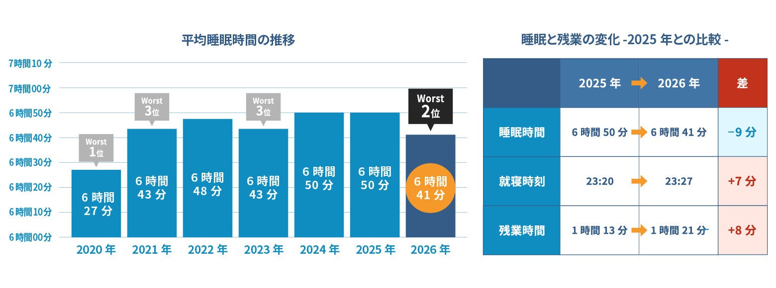 平均睡眠時間が再び減少、改善傾向が反転し過去ワースト水準へ