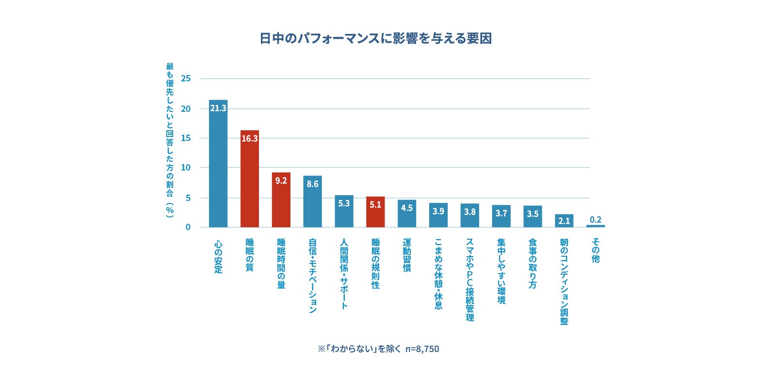 日中のパフォーマンスに影響を与える要因を個別にみると、「心の安定(21.3%)」や「睡眠の質(16.3%)」などが上位を占めています。一方で、睡眠に関する要因である「睡眠の量・質・規則性」を合算すると30.6%となり、単一の生活領域としては最も大きな割合となりました。この結果から、多くの人が睡眠を一つの行動としてではなく、量・質・リズムを含む包括的な生活基盤として捉え、集中力や体調、気分の安定に総合的な影響を与える重要な要因であると認識していることがうかがえます。