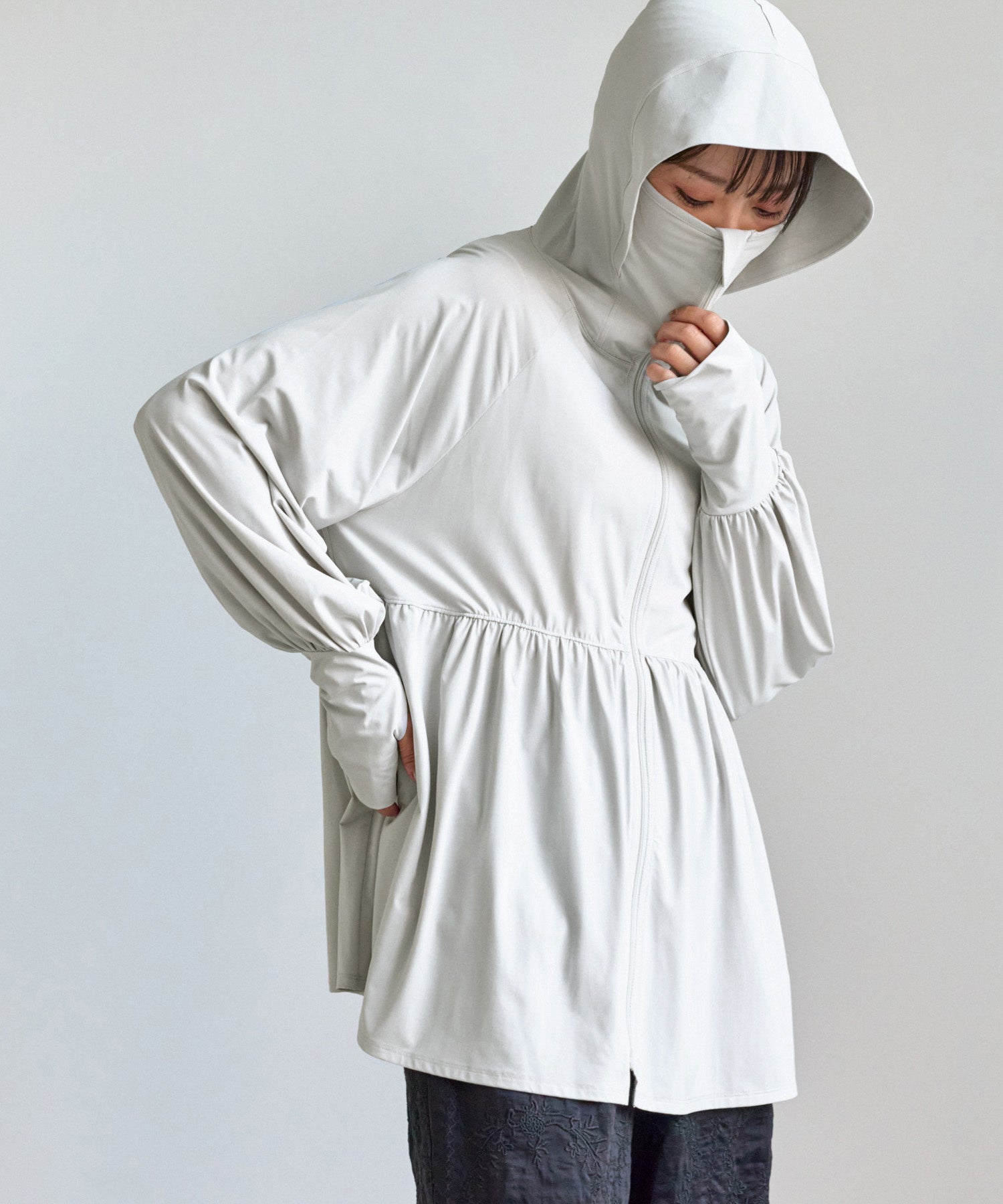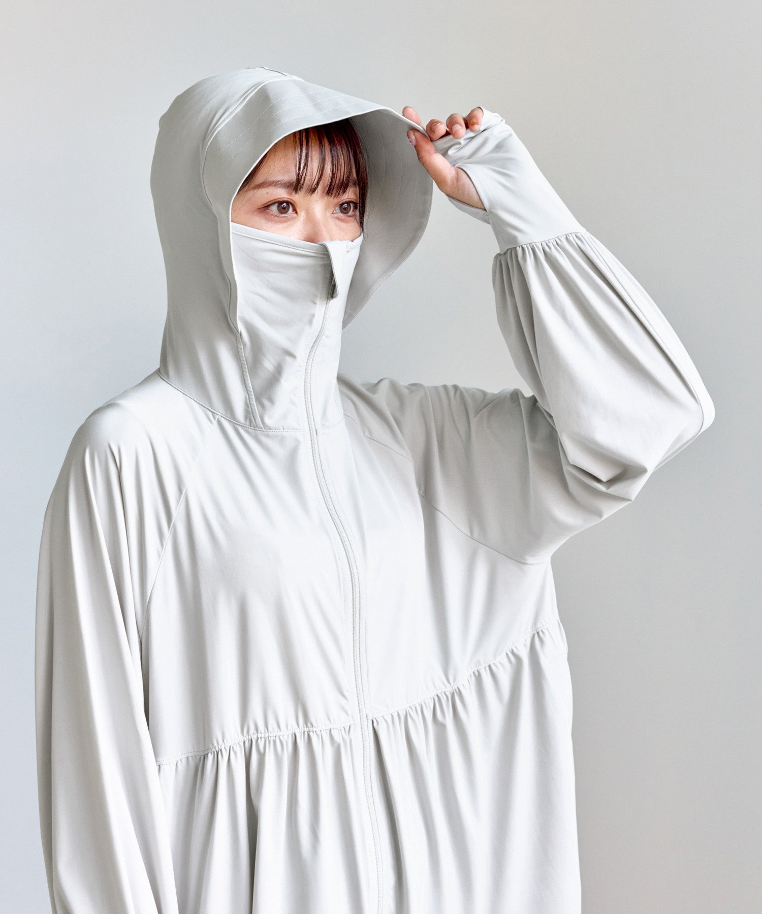 顔まわりから指先までしっかり肌を守ってくれるだけでなく、接触冷感素材により、紫外線が気になる季節も快適に着用いただけます。 つば付きのフードに加え、ファスナーを閉めることで鼻先まで覆うことができ、顔全体をしっかりカバーします。