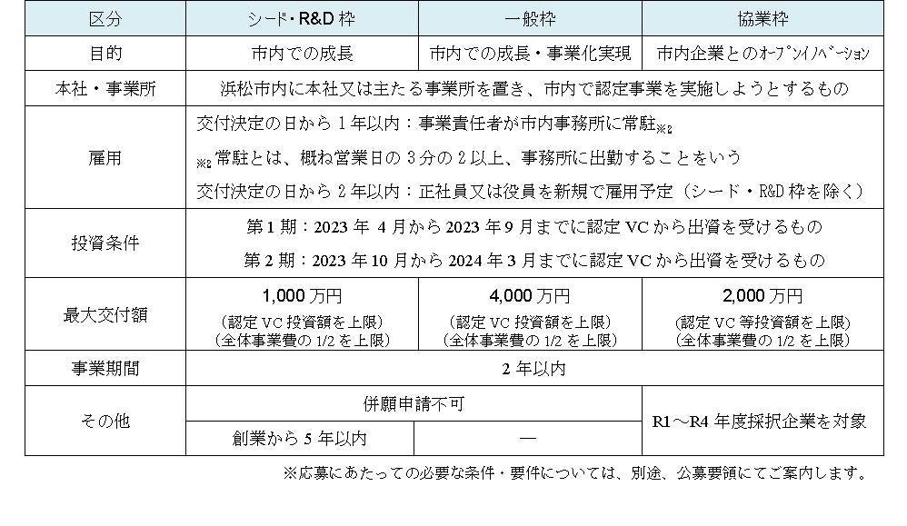 本事業は、急成長を目指す浜松市内のスタートアップが必要とする資金をVCの投資活動と協調して支援するとともに、スタートアップの経営基盤の強化や財務管理体制の整備についても併せて支援するものです。本制度では、「シード・R&D枠」、「一般枠」、「協業枠」の3つの区分を設けています。