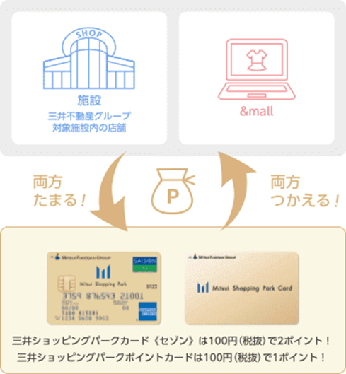 ご利用スタイルに合わせ、年会費永久無料でご利用特典多数の「三井ショッピングパークカード≪セゾン≫(クレジット機能付ポイントカード)」と「三井ショッピングパークポイントカード(クレジット機能なし)」をご用意しています。※一部対象外店舗等があります。