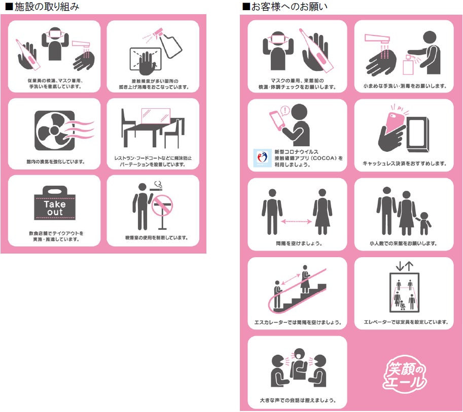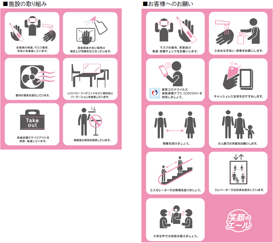 三井不動産グループが運営する商業施設では、新型コロナウイルス感染拡大防止のため、下記をはじめとした様々な取り組みを実施しております。