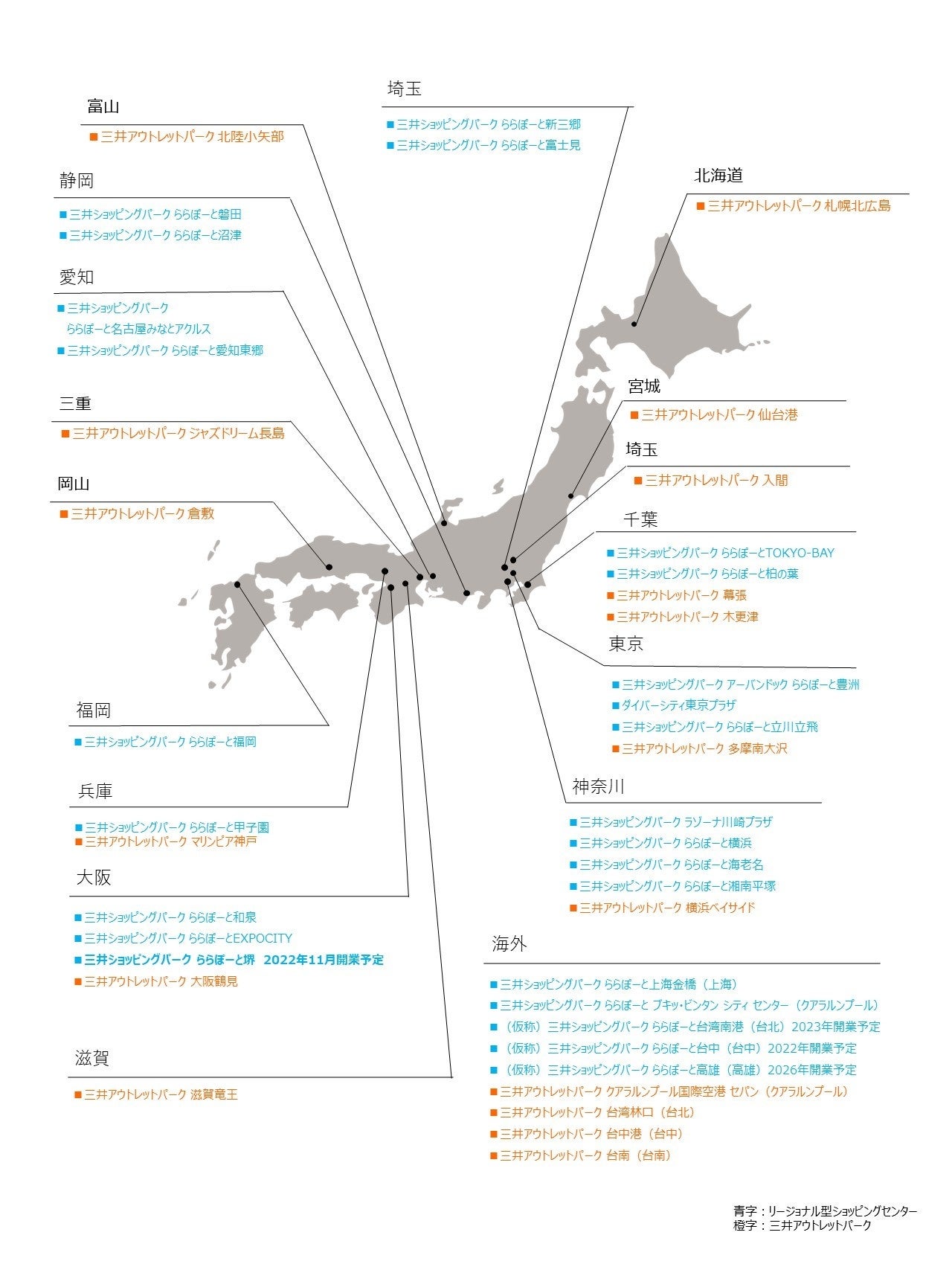 三井不動産のリージョナル型ショッピングセンターおよび三井アウトレットパーク(2022年6月時点)