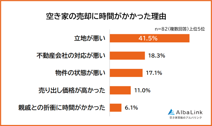 「空き家の売却に時間がかかった理由」のダントツは、「立地が悪い(41.5%)」でした。2位「不動産会社の対応が悪い(18.3%)」、3位「物件の状態が悪い(17.1%)」と答えた人も多くなっています。