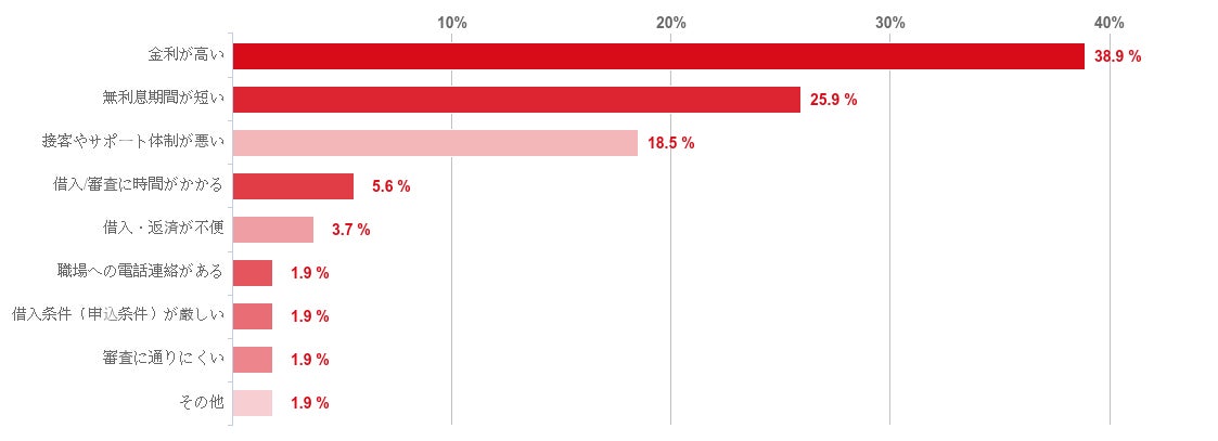 SMBCモビットと同じ大手の消費者金融を比較対象としている人が多かった。SMBCモビットの金利はもちろん、審査や手続きの利便性・スピードなどを比べていると考えられる。