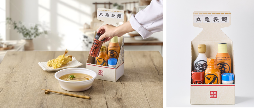 ≪丸亀製麺のうどんや天ぷらとの相性を考えたこだわりの調味料五種の“旨い”をまとめて、ひと箱に≫
